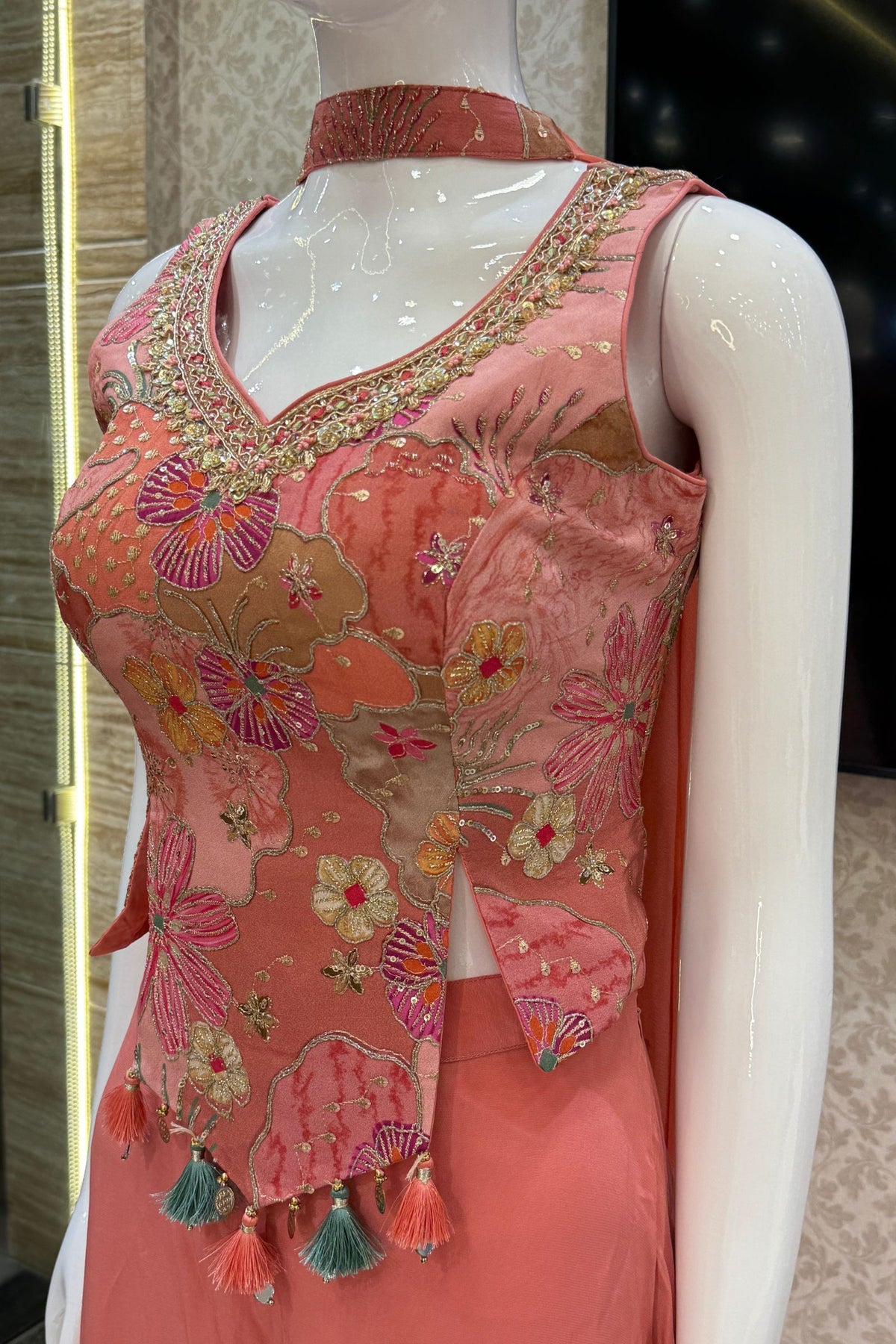 Peach Sequins, Zari, Zardozi and Stone work with Multicolor Digital Print Palazzo Suit Set