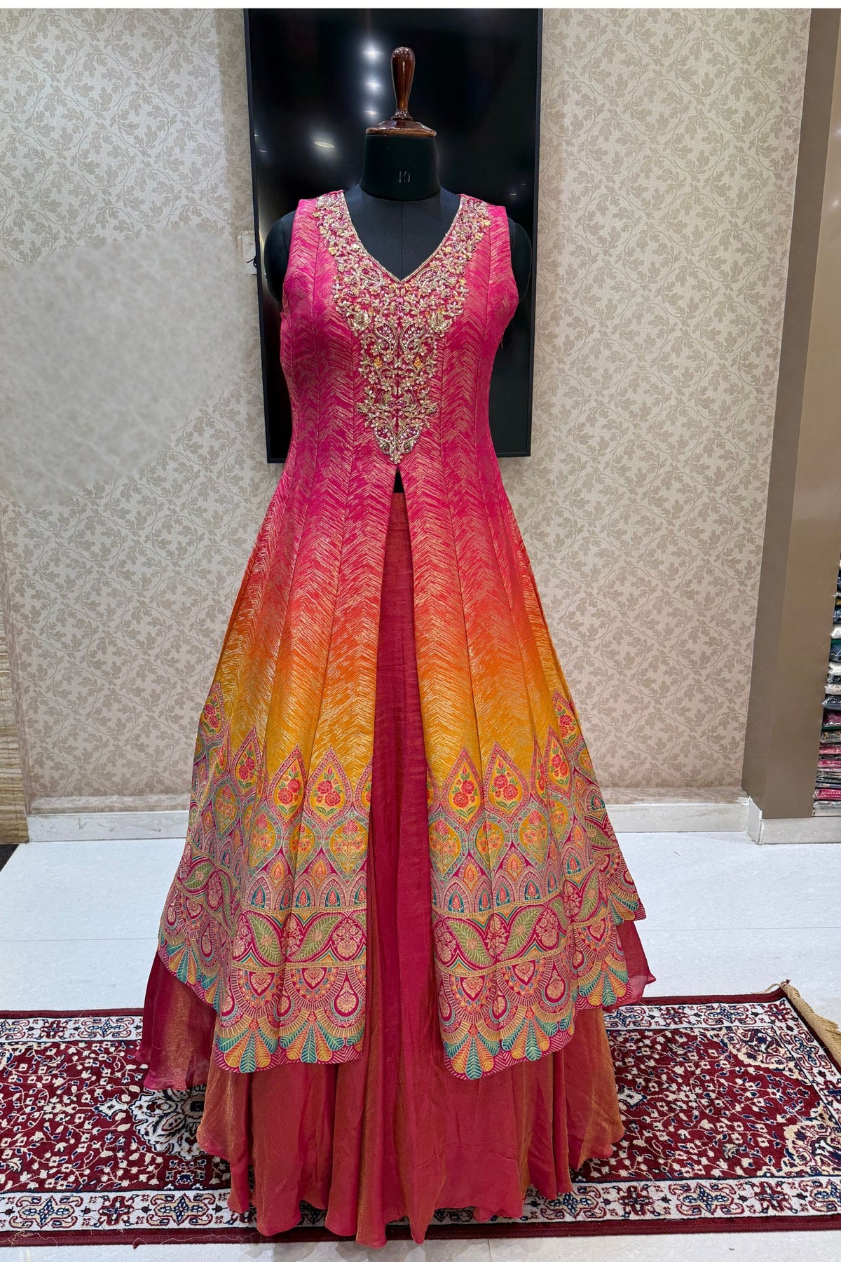 Pink with Mustard Banaras, Beads, Sequins and Stone work Mastani Styled Long Top Lehenga
