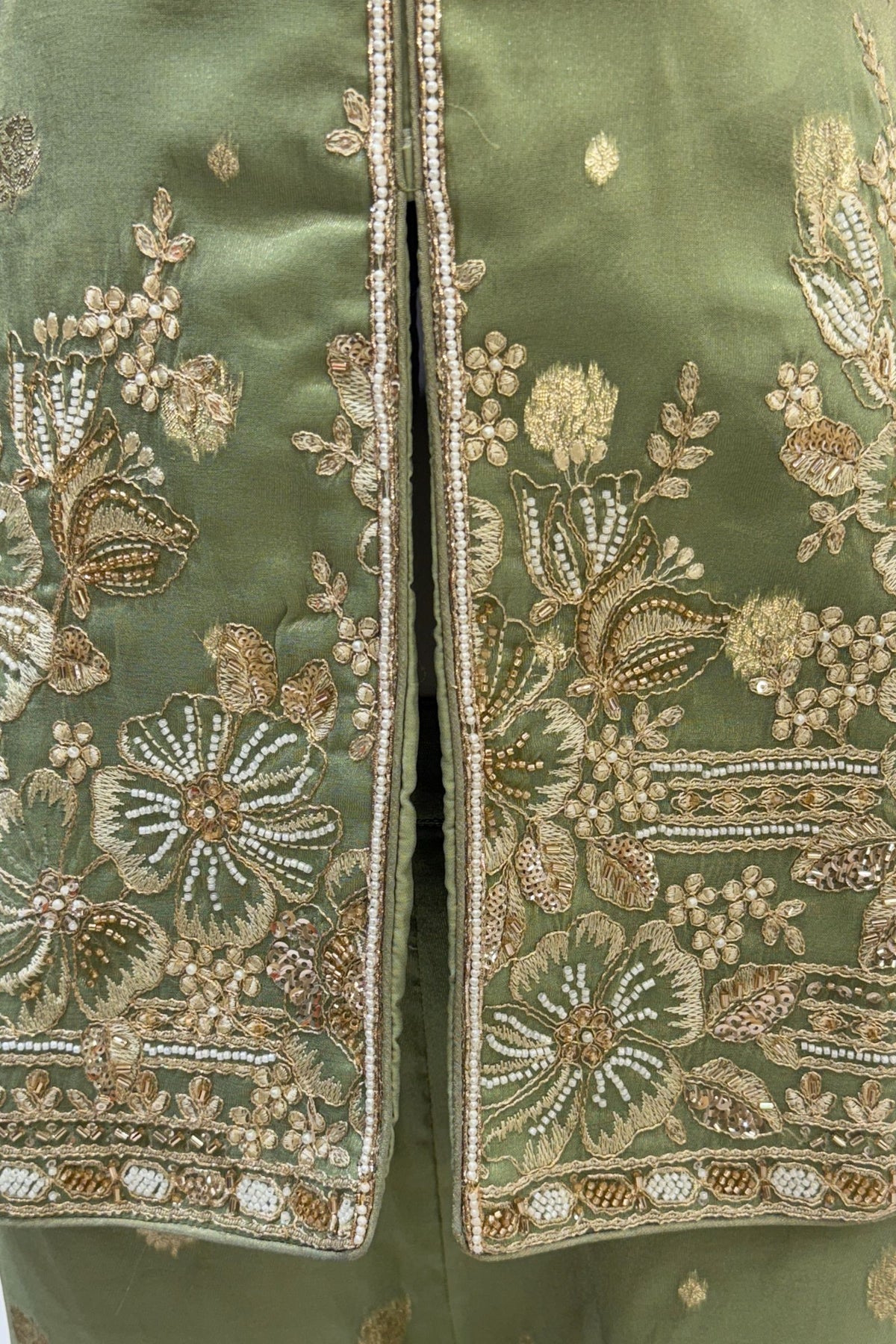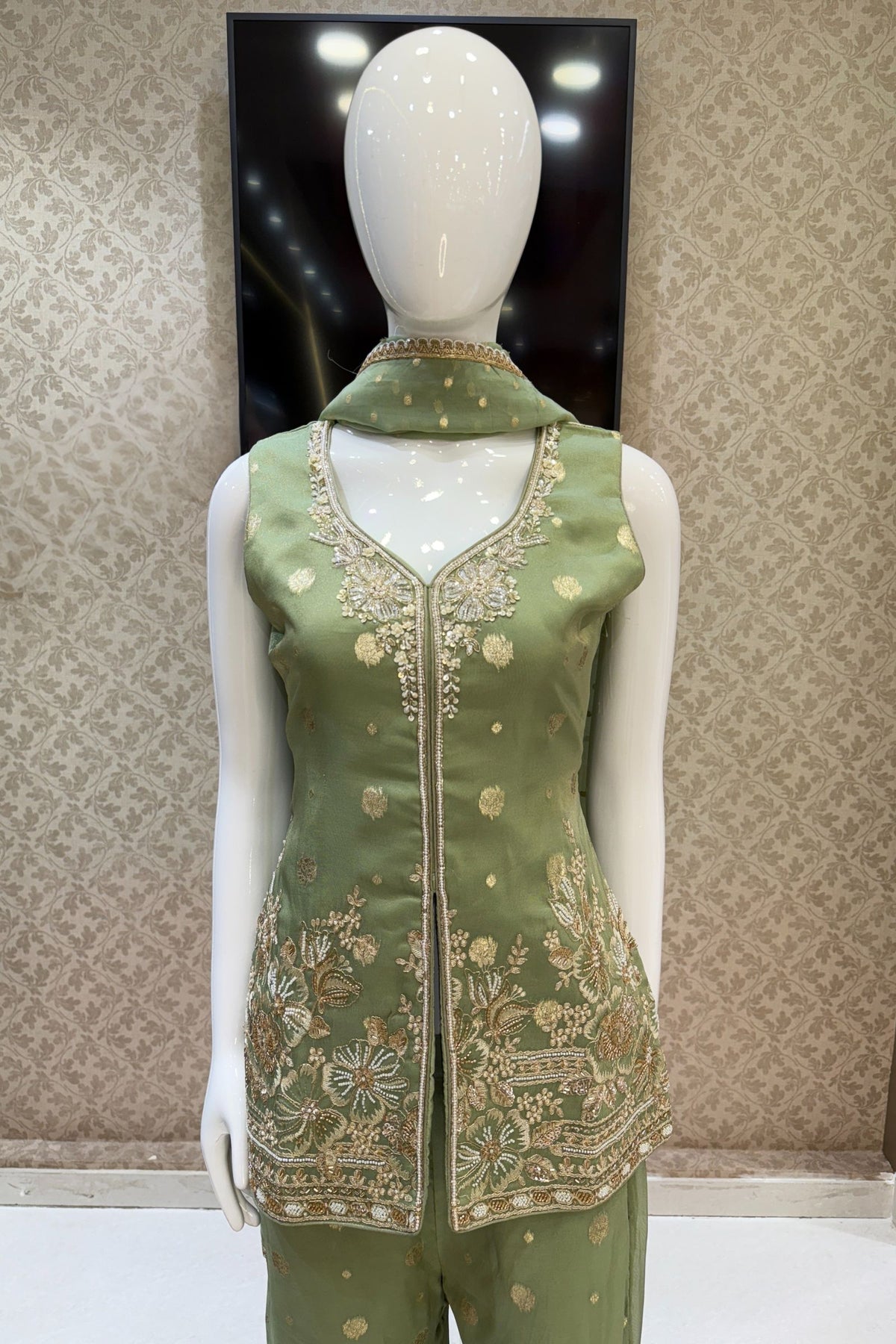 Pista Green Beads, Banaras, Sequins, Stone, and Thread work Salwar with Palazzo Pant