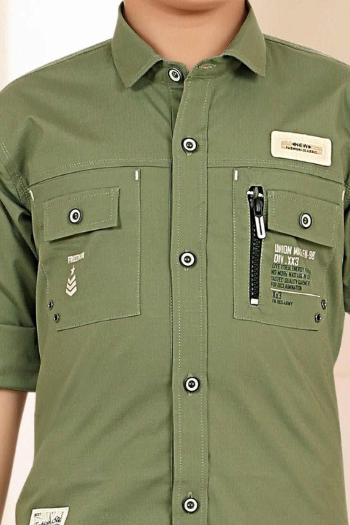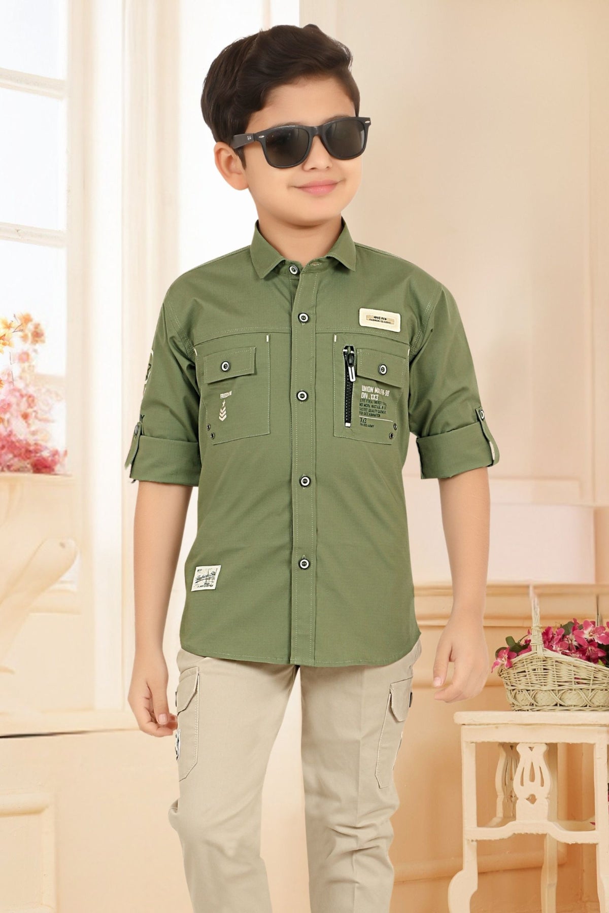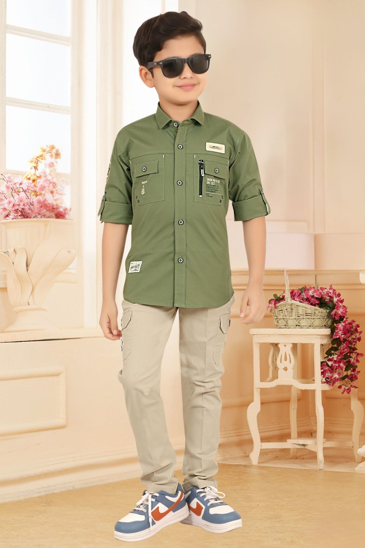Pista Green Printed Shirt and Beige Pant Set for Boys