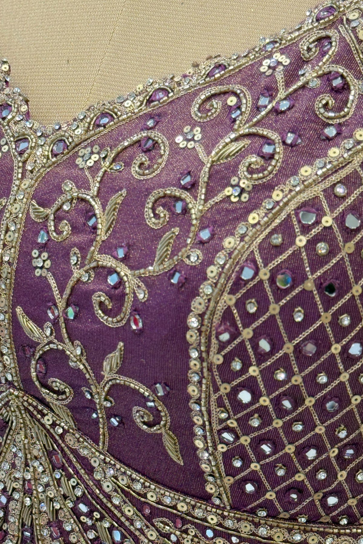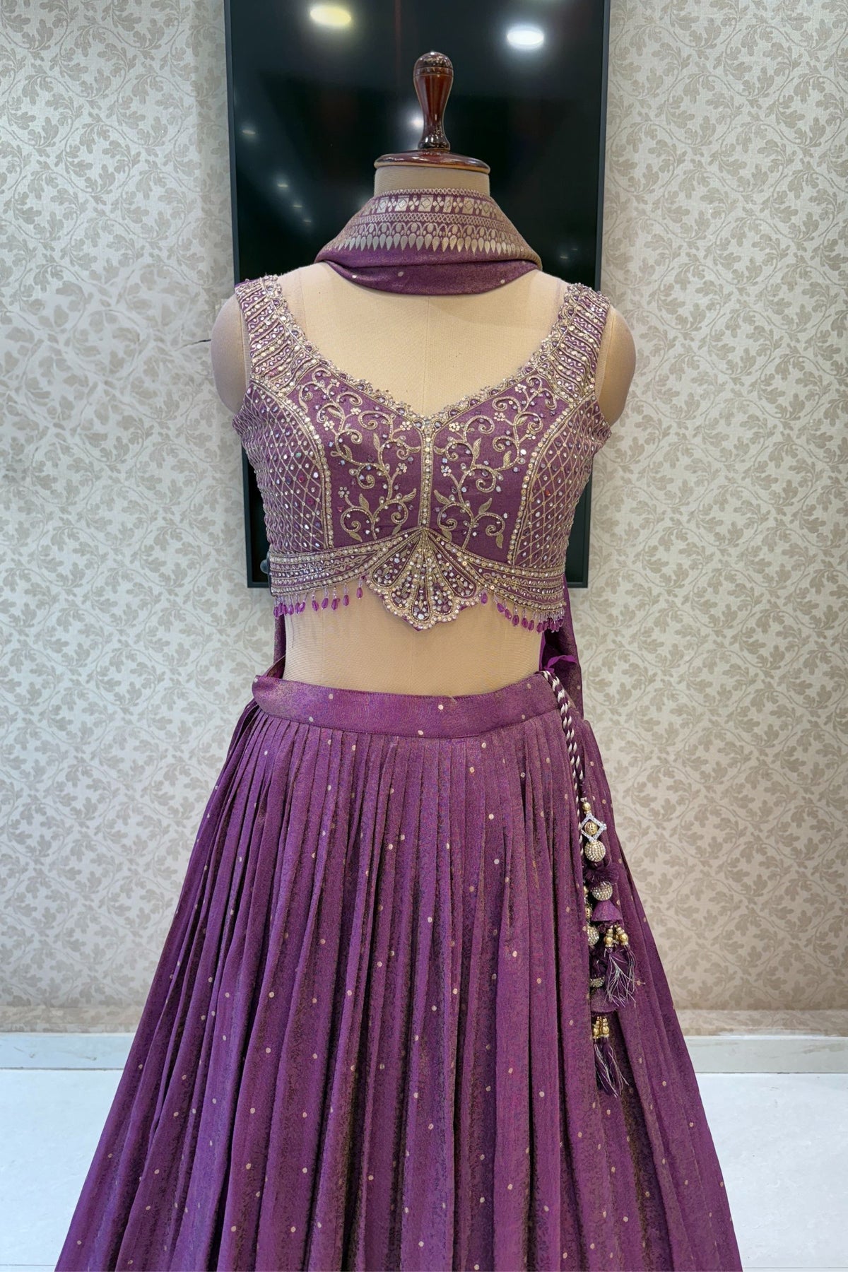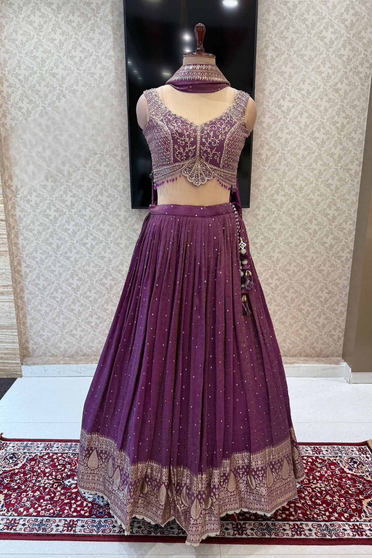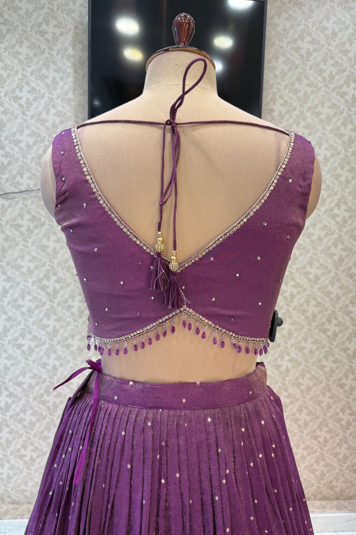 Purple Mirror, Stone, Beads, Zardozi, Zari, Sequins and Banaras work Crop Top Lehenga