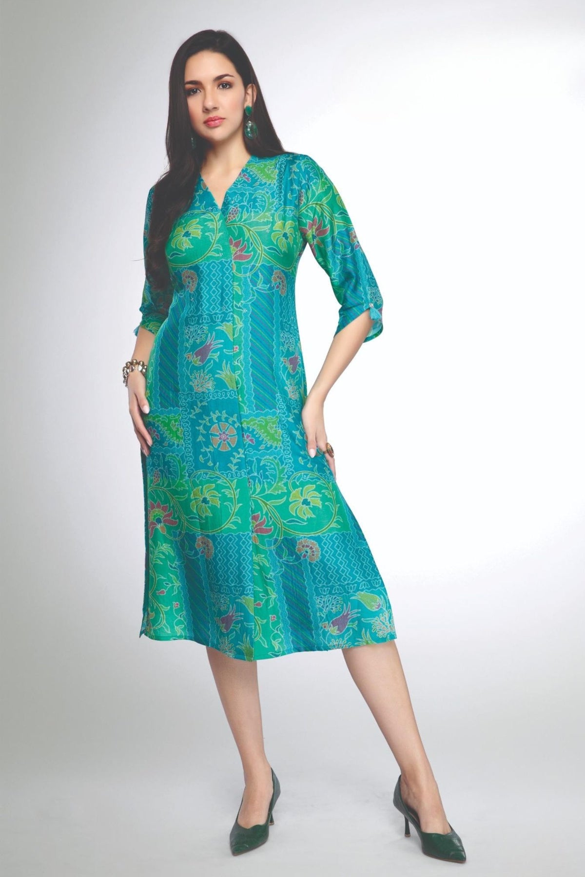 Rama Blue with Green Digital Print and Stone work Calf Length Kurti