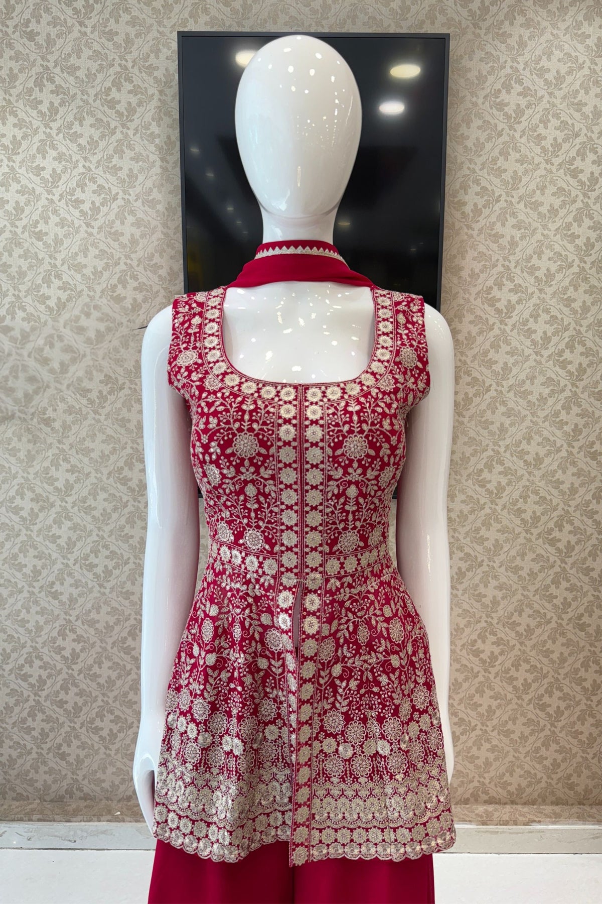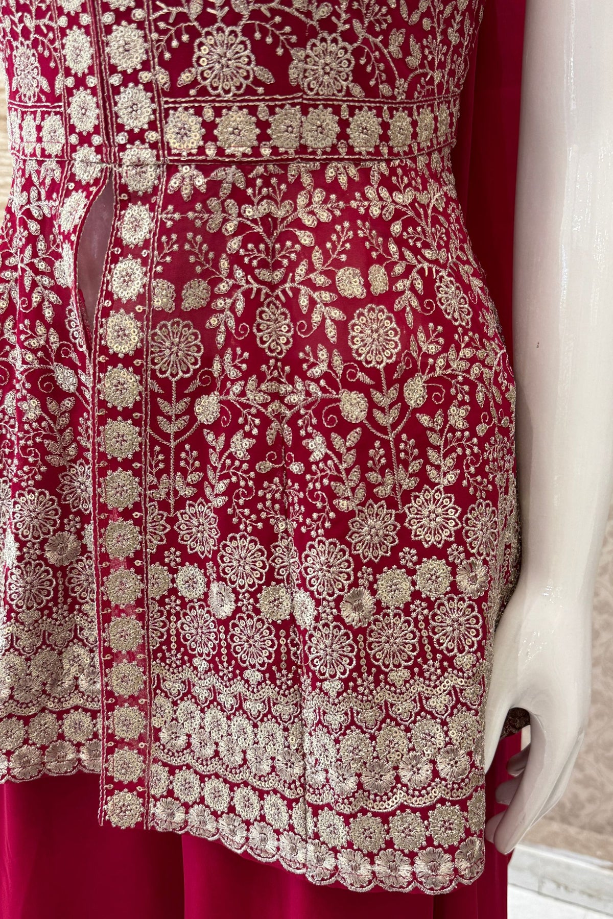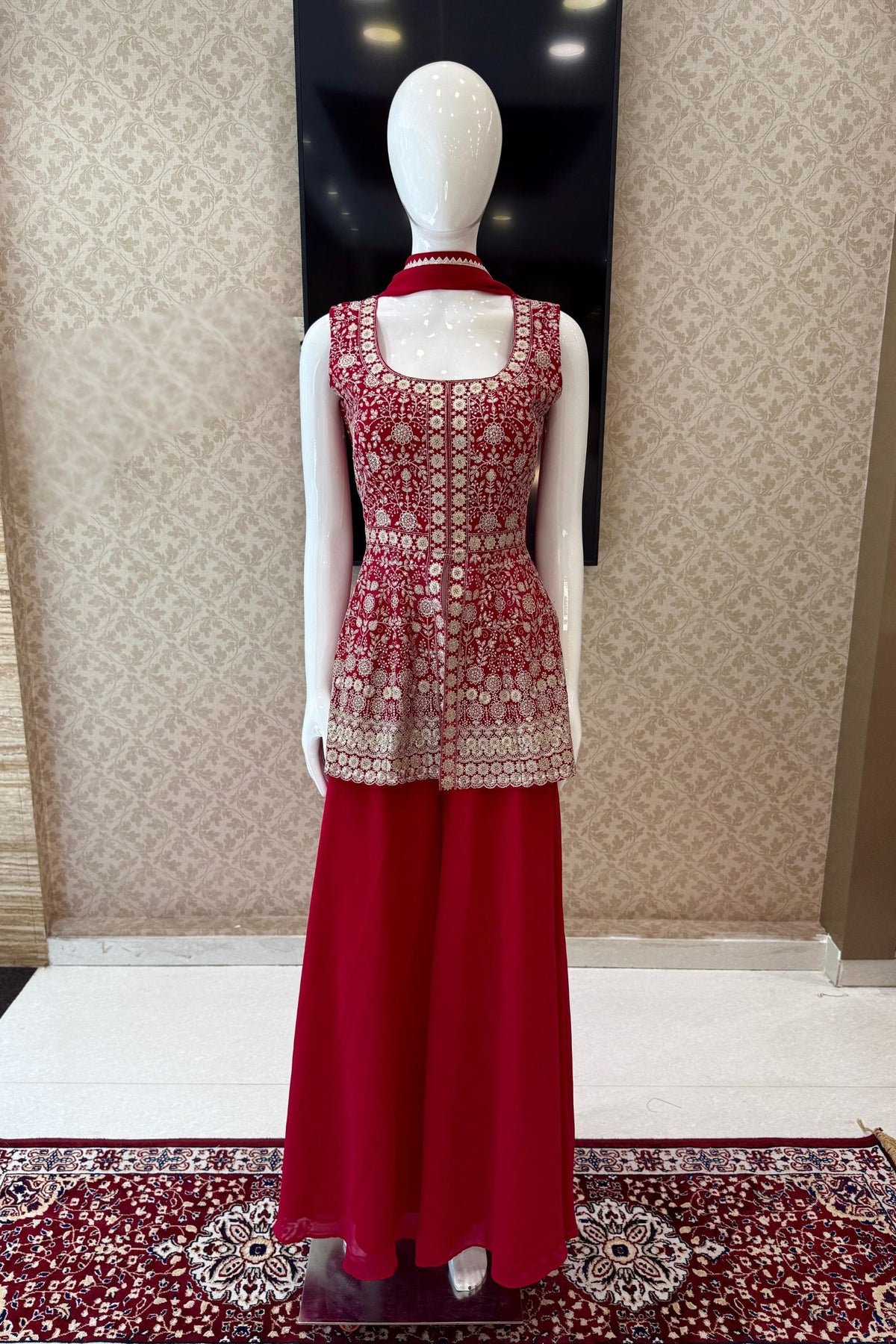 | Fabric | Peplum Top - Georgette, Palazzo - Georgette, Sleeves -Georgette and Dupatta - Georgette |