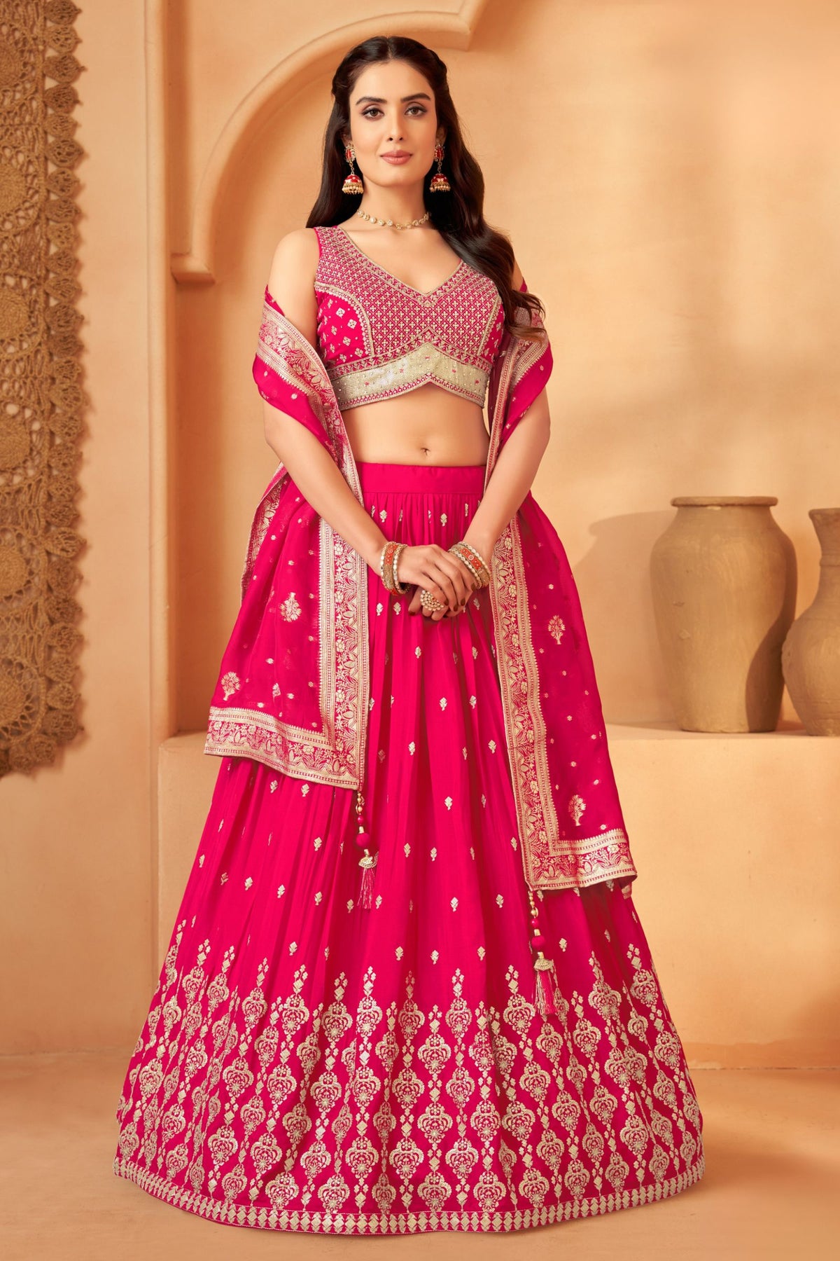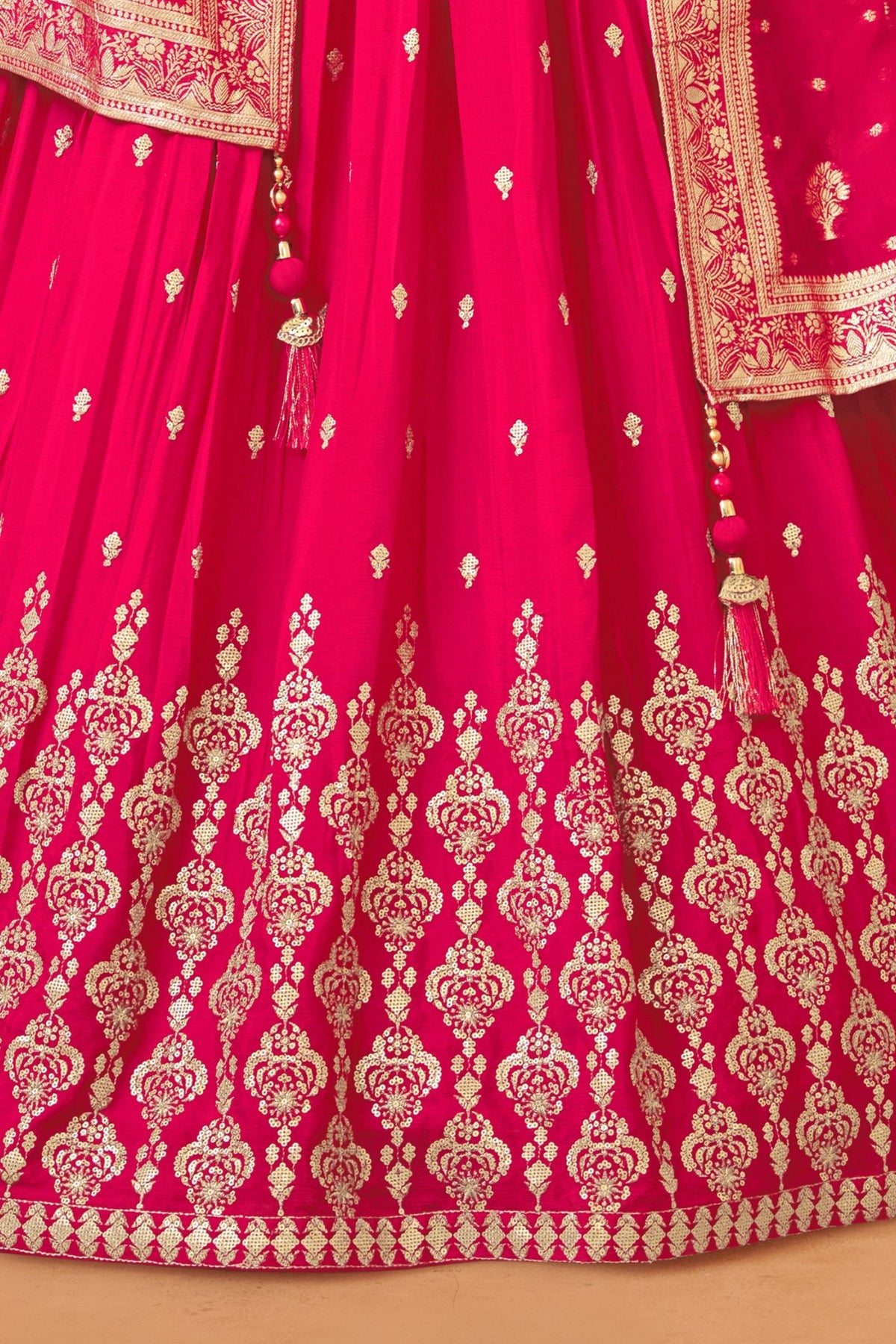 Rani Pink Stone, Zari, Sequins and Beads work Crop Top Lehenga with Banaras work Dupatta