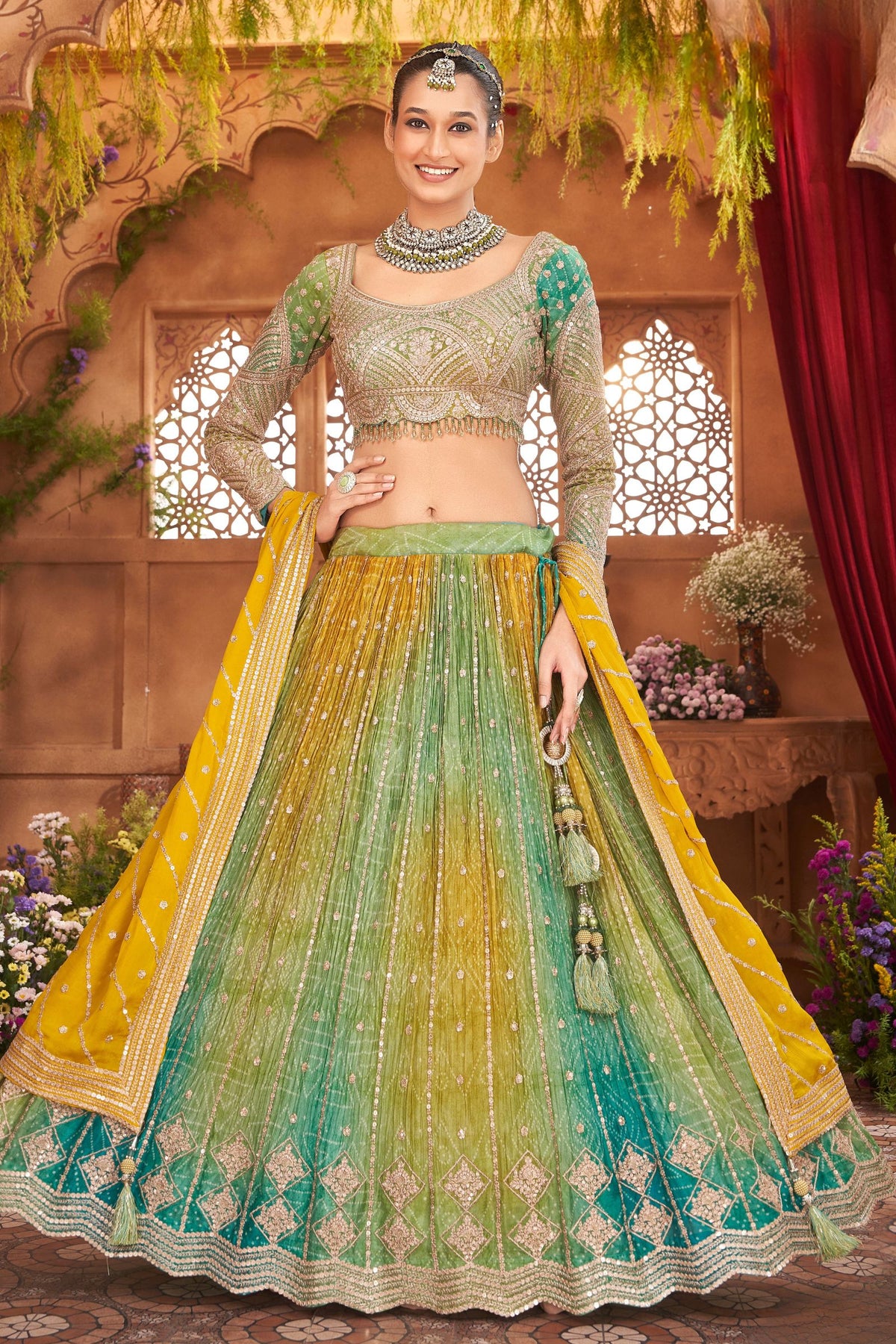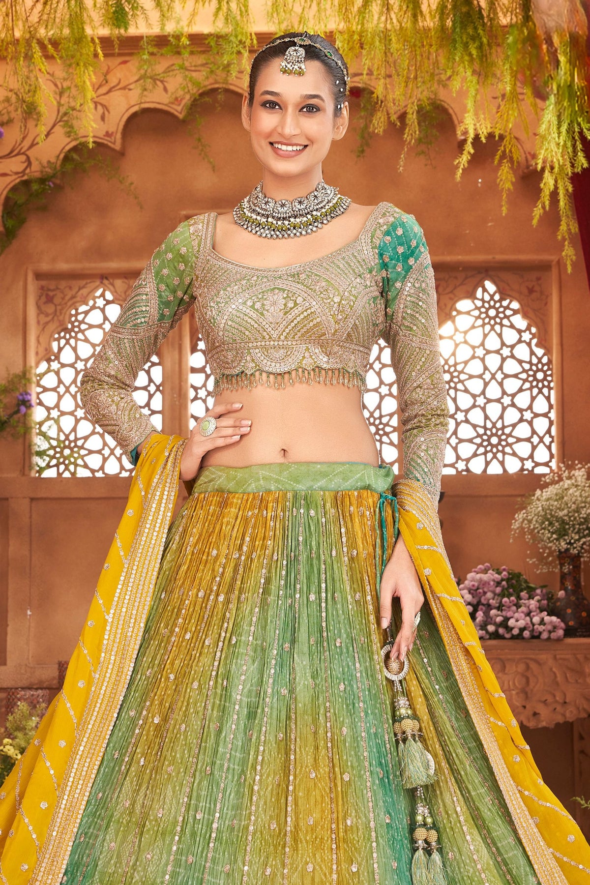 Yellow with Green Sequins, Zari and Beads work with Bandini Print Crop Top Lehenga