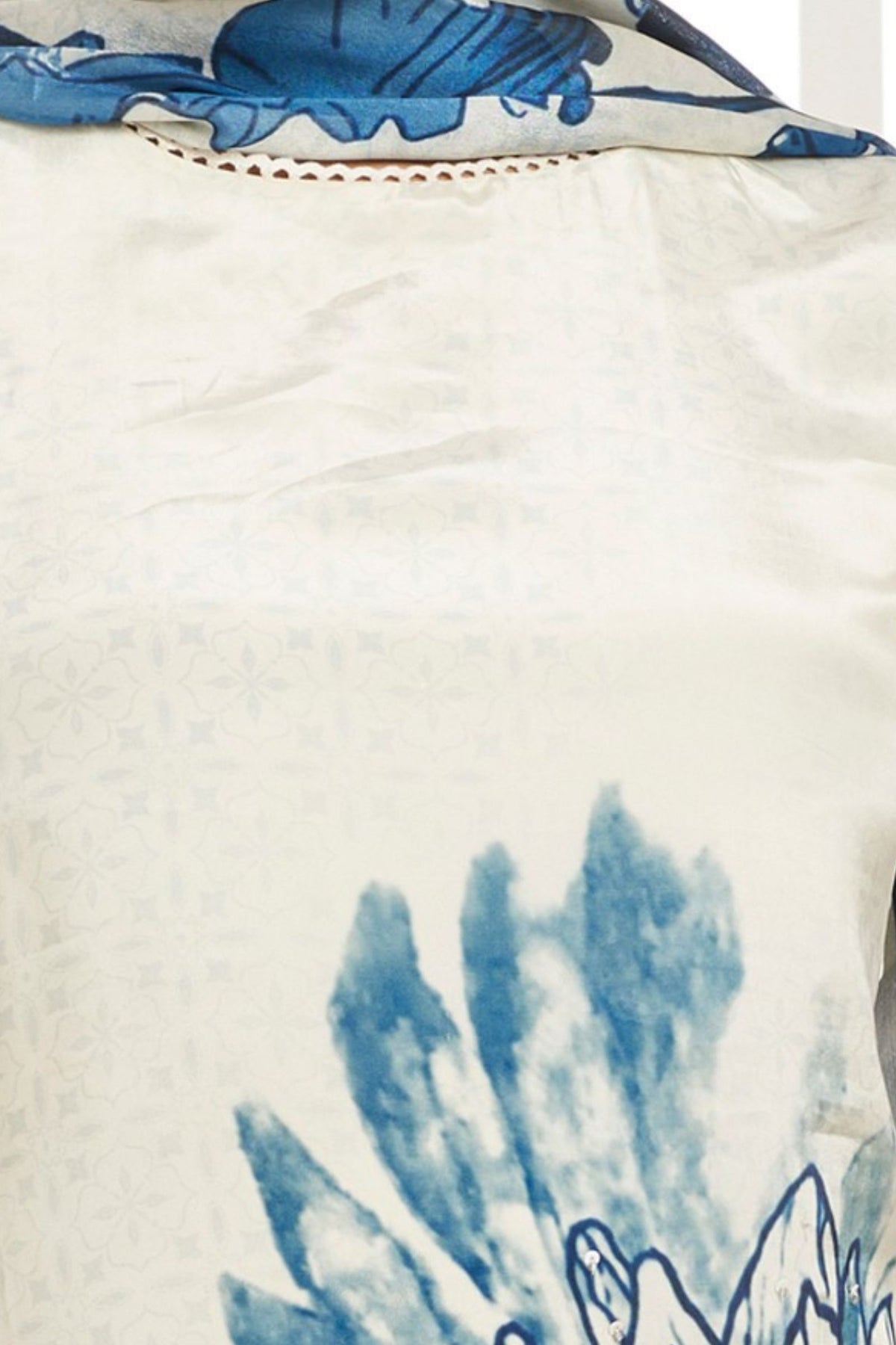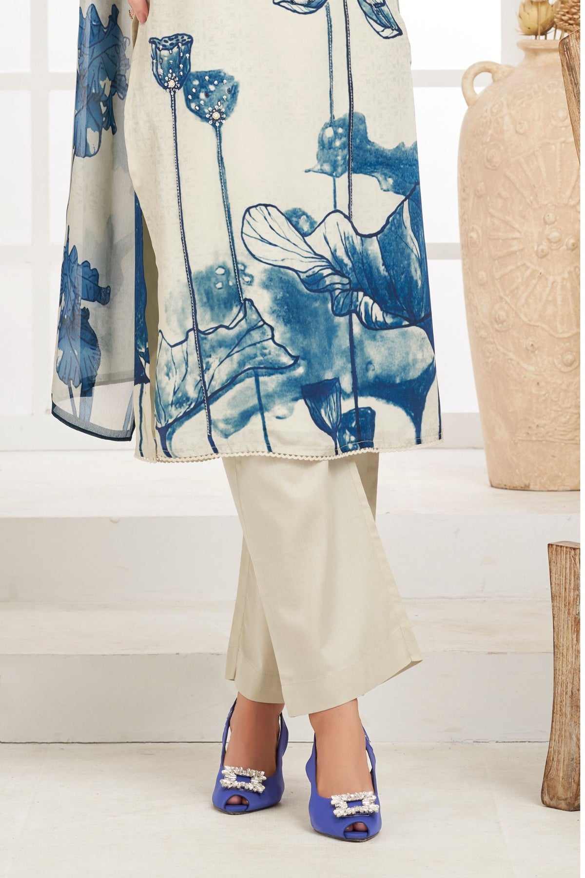 Beige with Blue Floral Print, Beads, Mirror and Sequins work Straight Cut Salwar Suit