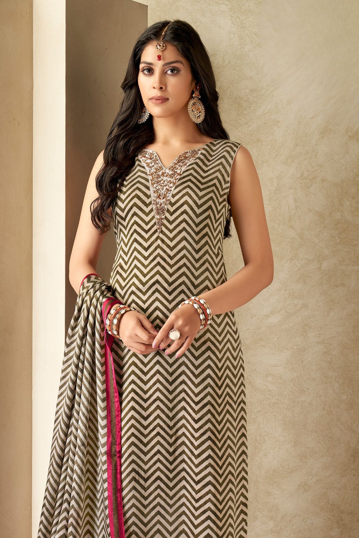 Beige with Brown Zig Zag Print, Beads, Sequins and Zardozi work Straight Cut Salwar Suit