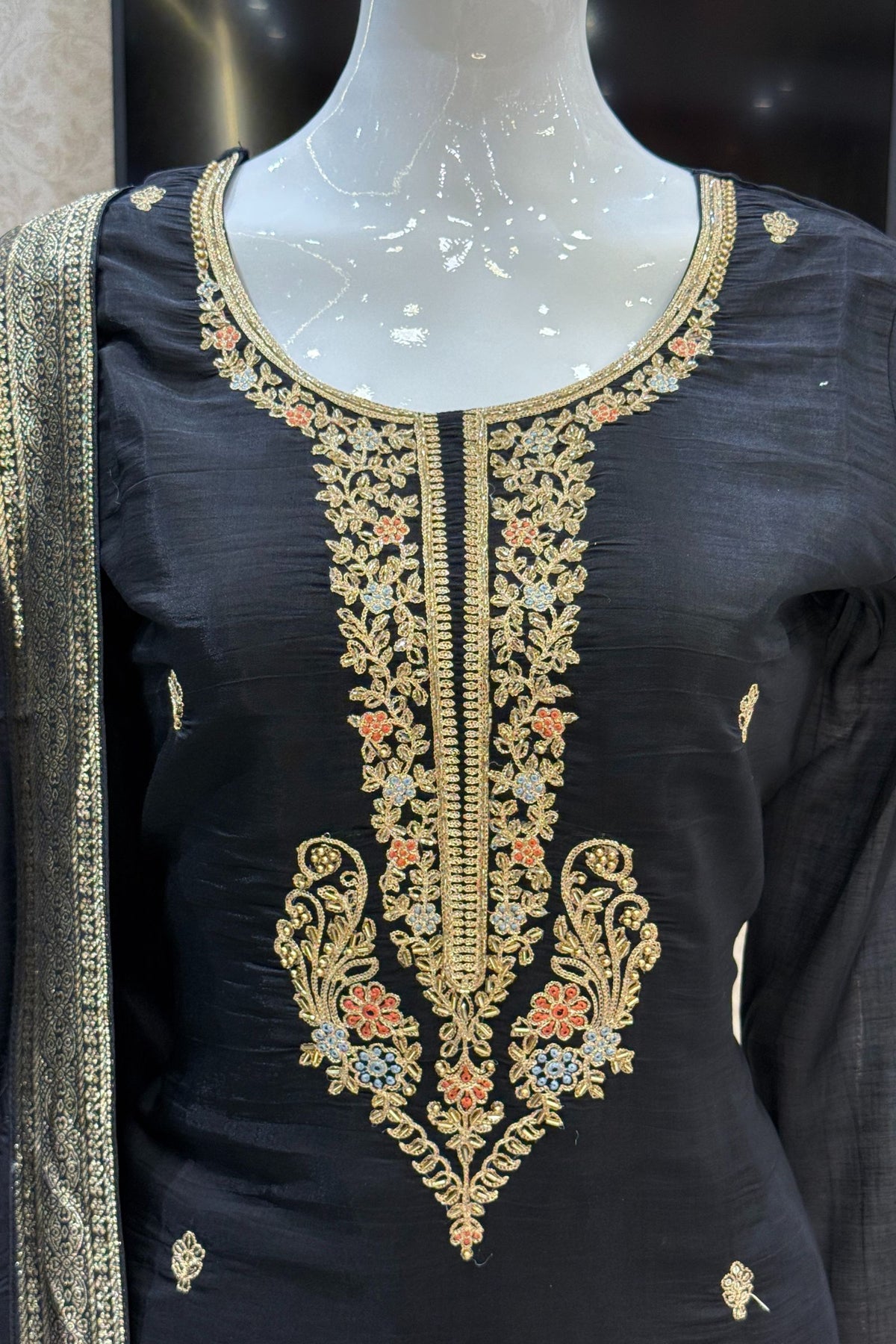 Black Beads, Zari, Sequins and Thread work with Floral Print Straight Cut Salwar Suit