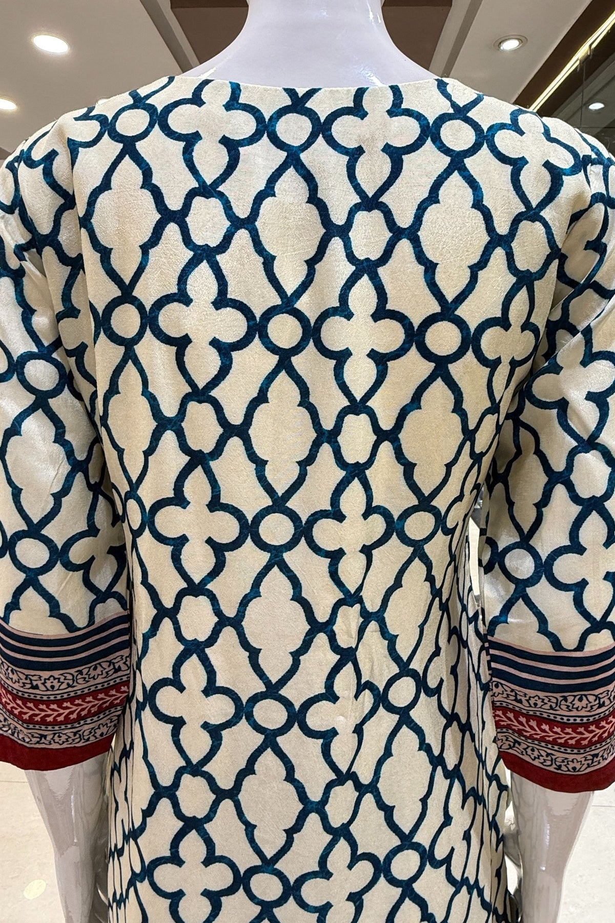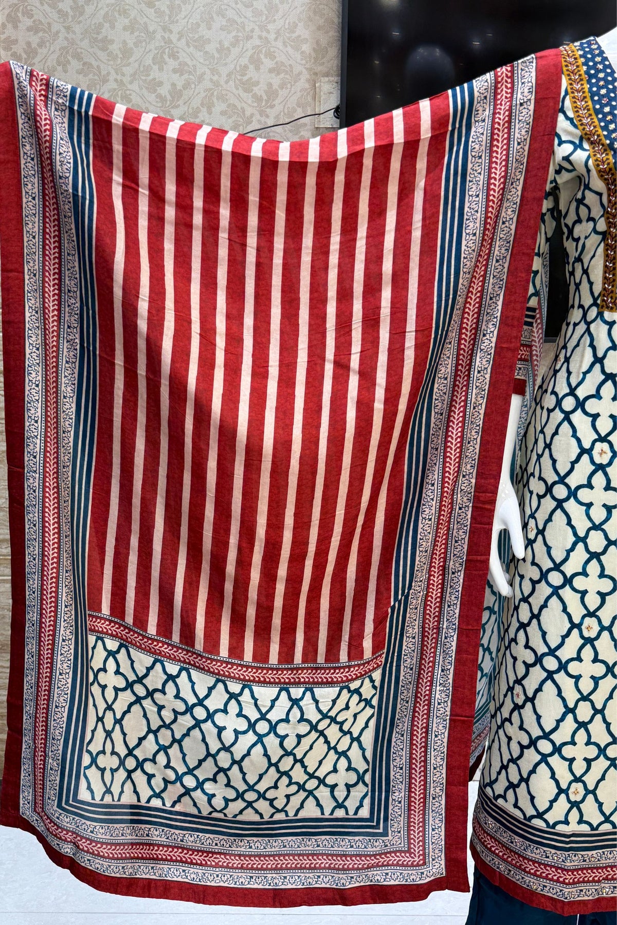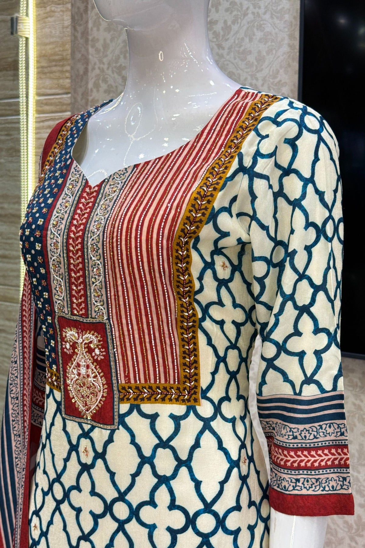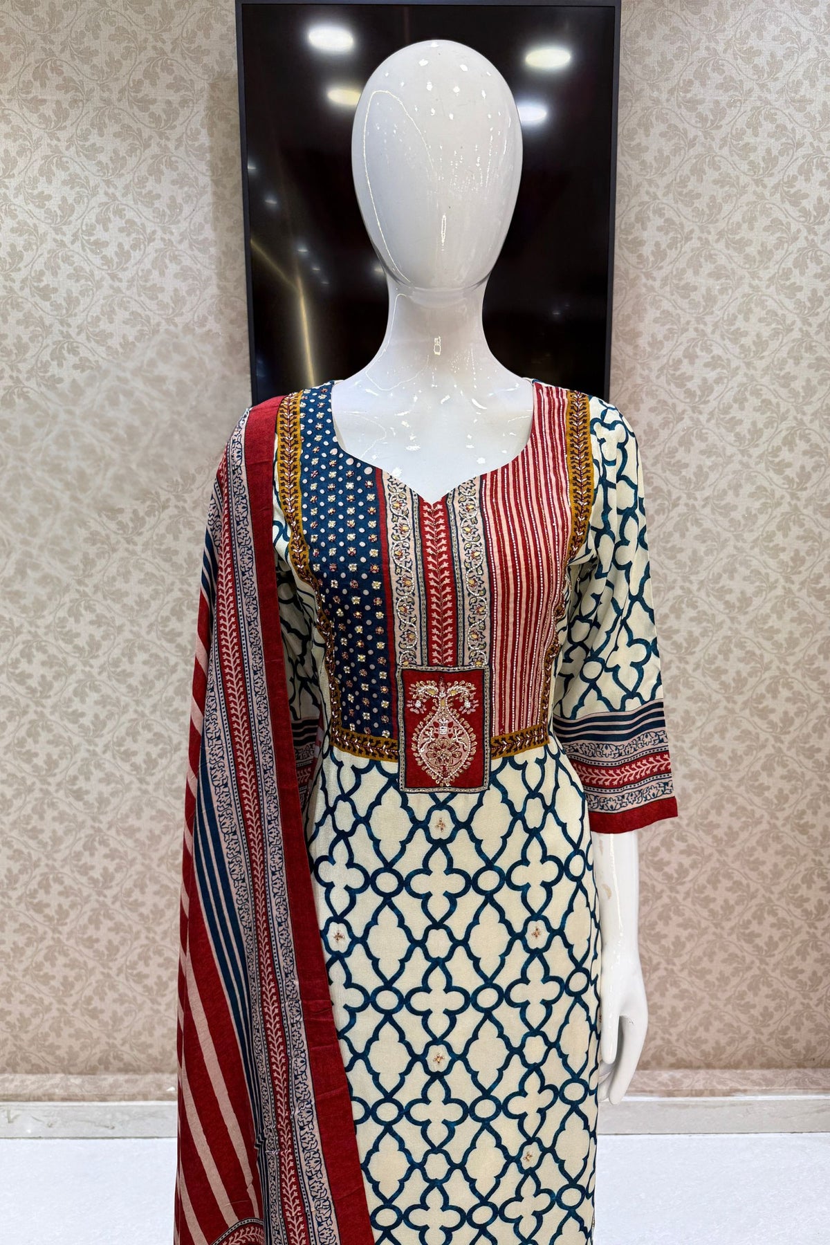 Cream with Peacock Blue Beads and Mirror work with Ajrakh Print Straight Cut Salwar Suit