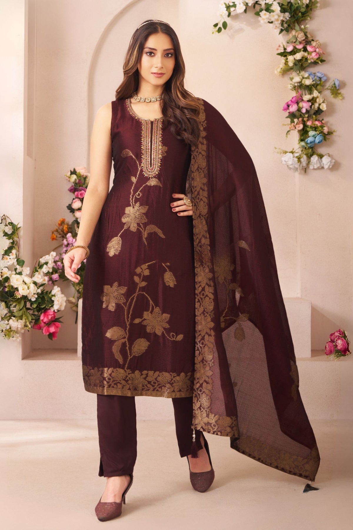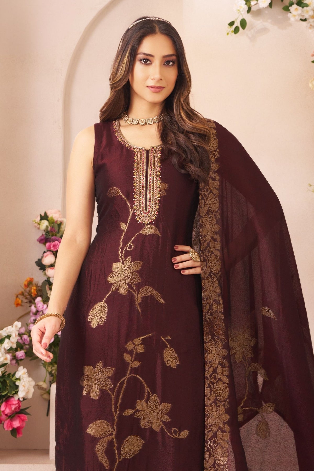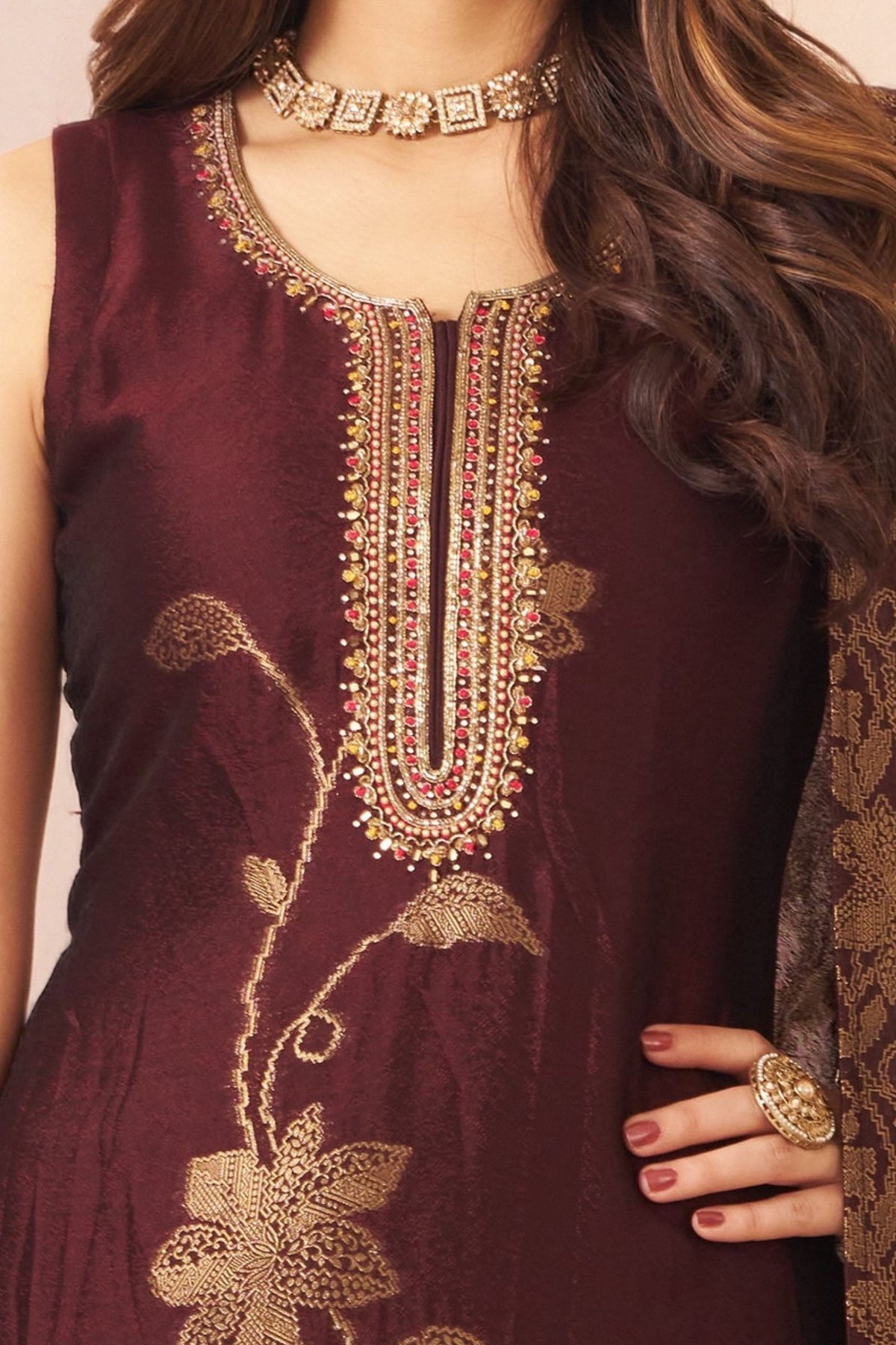 Dark Wine Banaras, Beads, Mirror and Stone work Straight Cut Salwar Suit