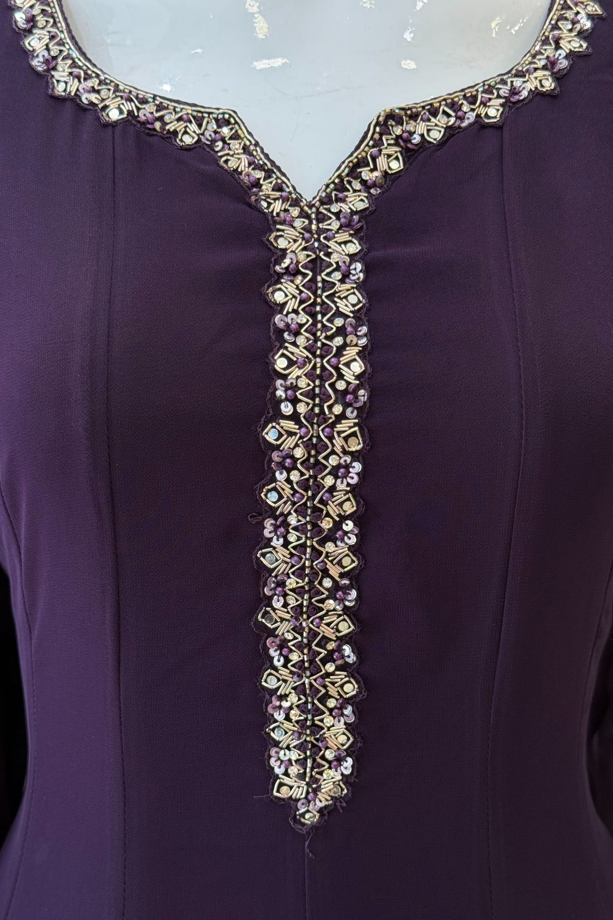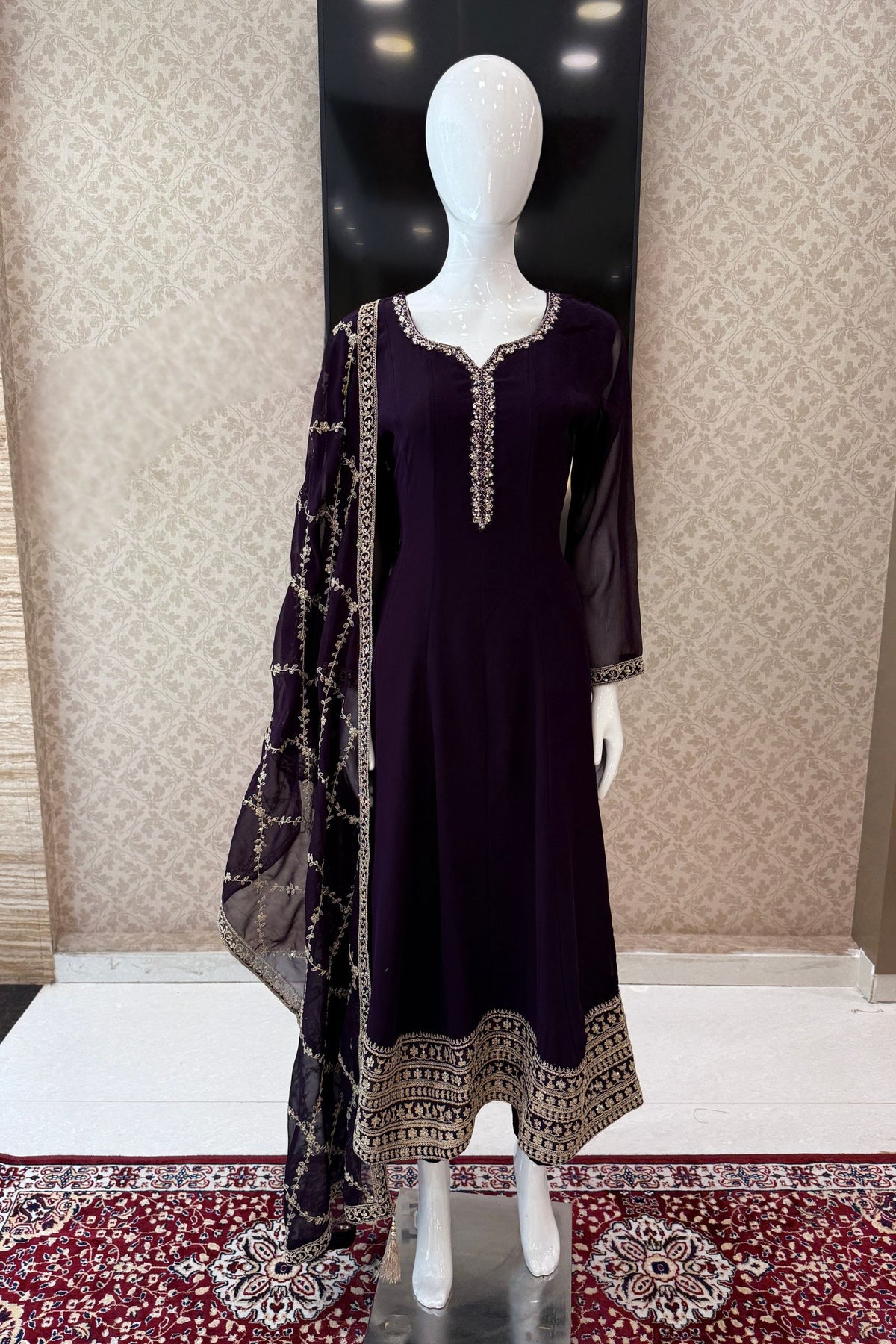 Dark Wine Stone, Sequins, Zardozi and Beads work Aline Cut Salwar Suit