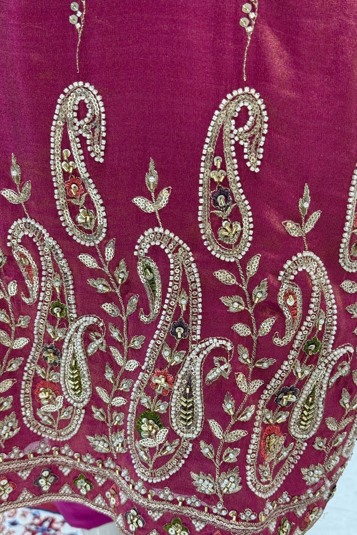Magenta Pink Beads, Zardozi, Mirror, Pearl, Zari and Sequins work Straight Cut Salwar Suit