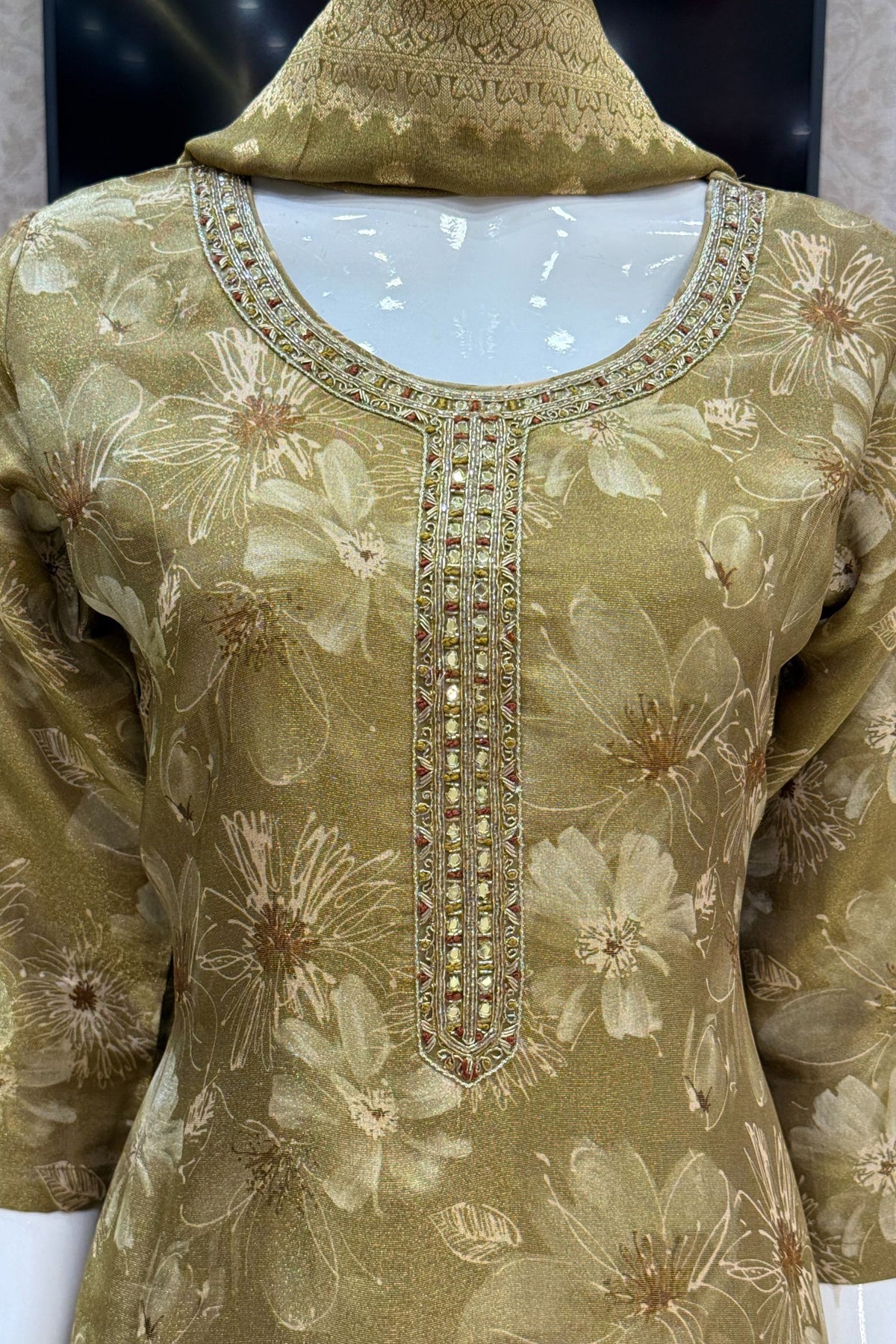 Olive Green Mirror, Zardozi and Banaras work with Floral Print Straight Cut Salwar Suit
