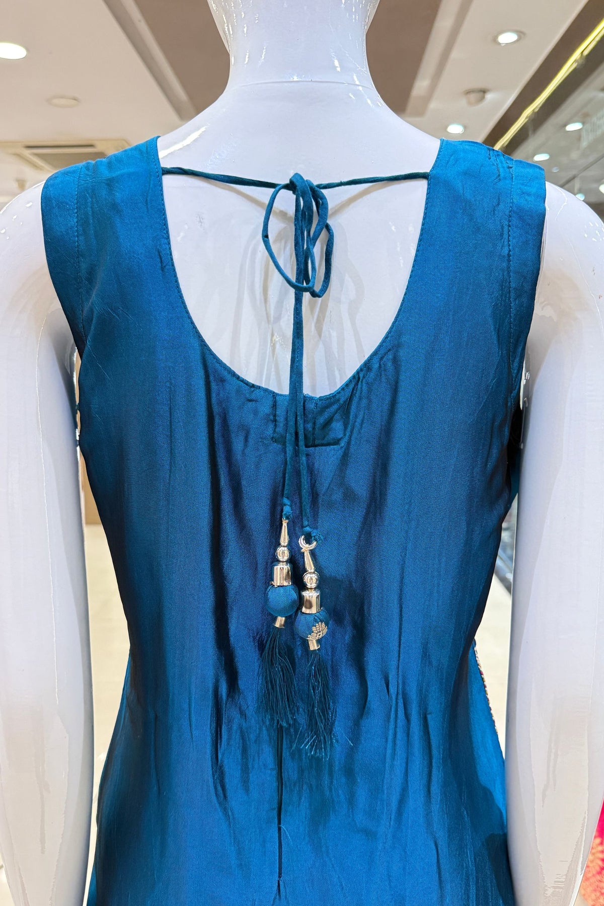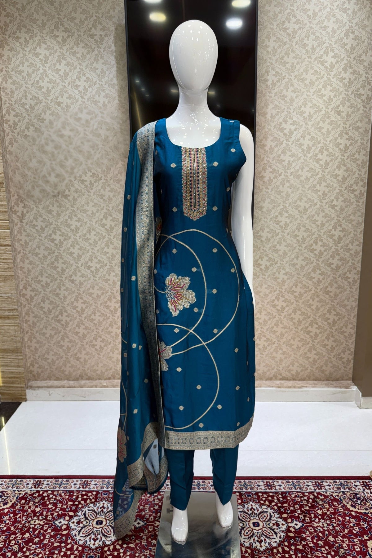 Peacock Blue Banaras, Beads and Sequins work Straight Cut Salwar Suit