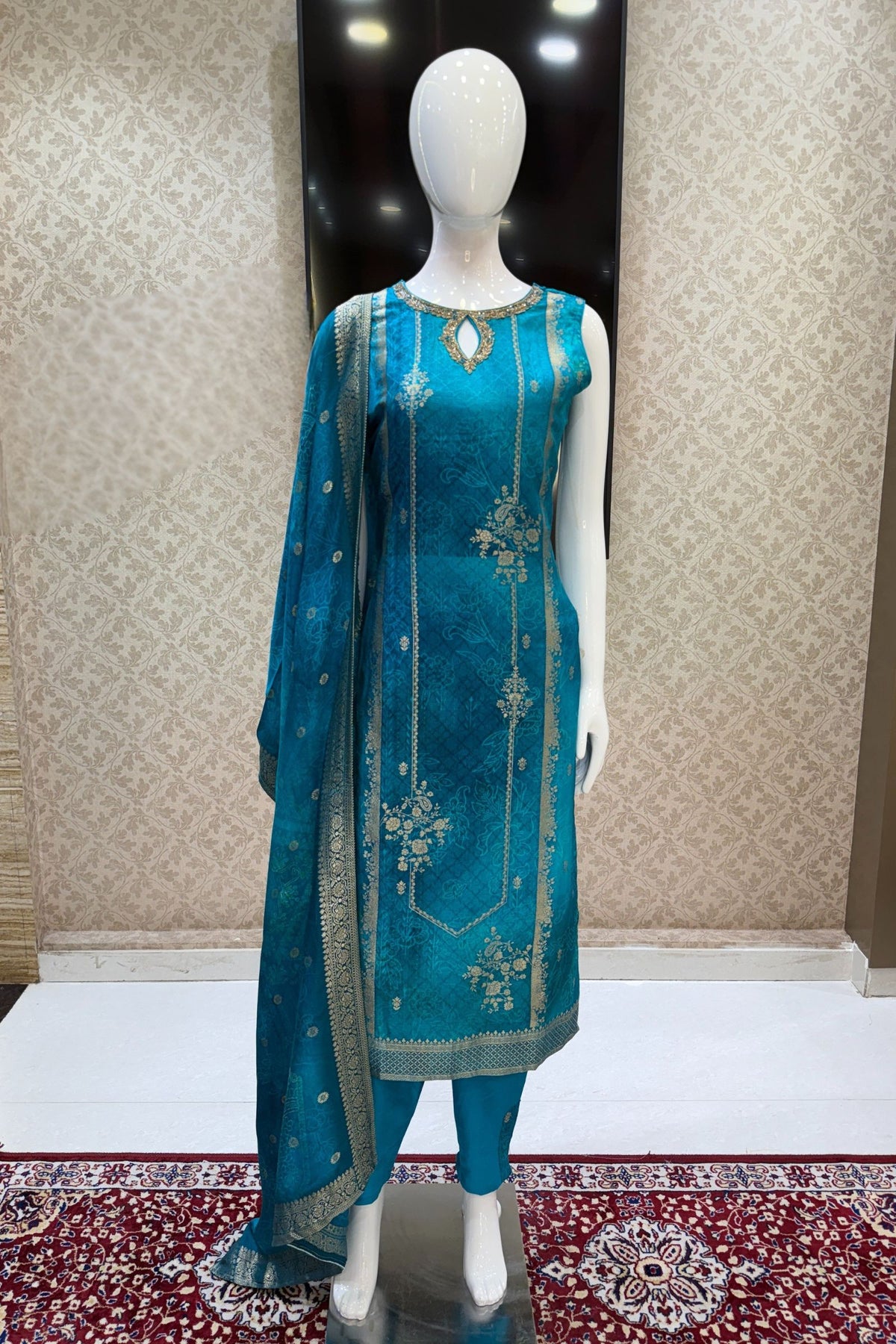 Rama Blue Banaras, Zardozi, Beads, Stone and Zari work Straight Cut Salwar Suit
