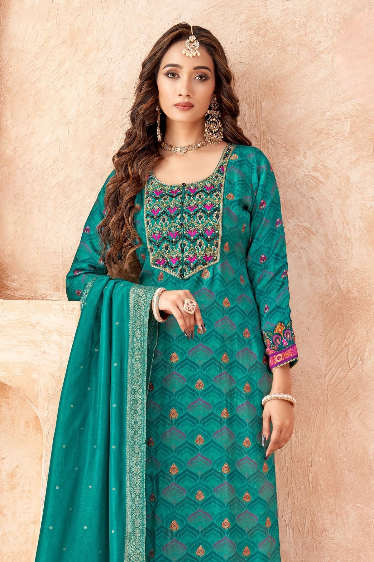 Rama Green Banaras and Embroidery work with Multicolor Digital Print Straight Cut Salwar Suit