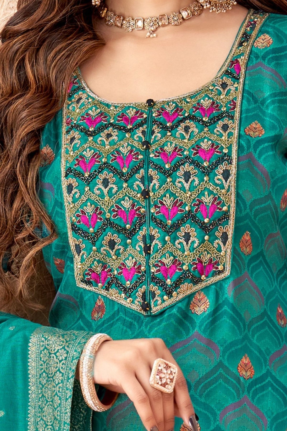 Rama Green Banaras, Zardozi, Beads and Embroidery work with Multicolor Digital Print Straight Cut Salwar Suit