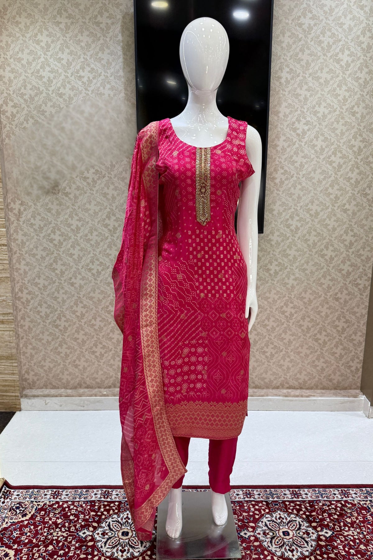 Rani Pink Banaras and Zari Weaving work with Bandini Print Straight Cut Salwar Suit