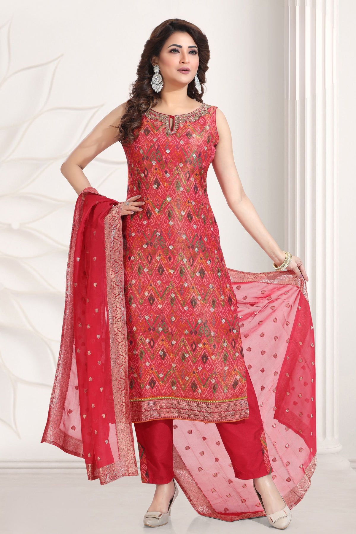 Red Beads, Banaras, Sequins and Zari work with Patola Print Straight Cut Salwar Suit