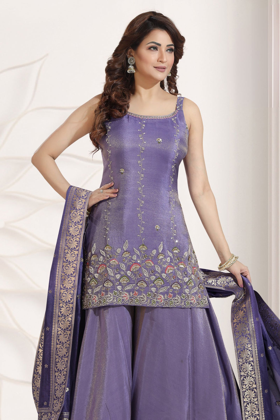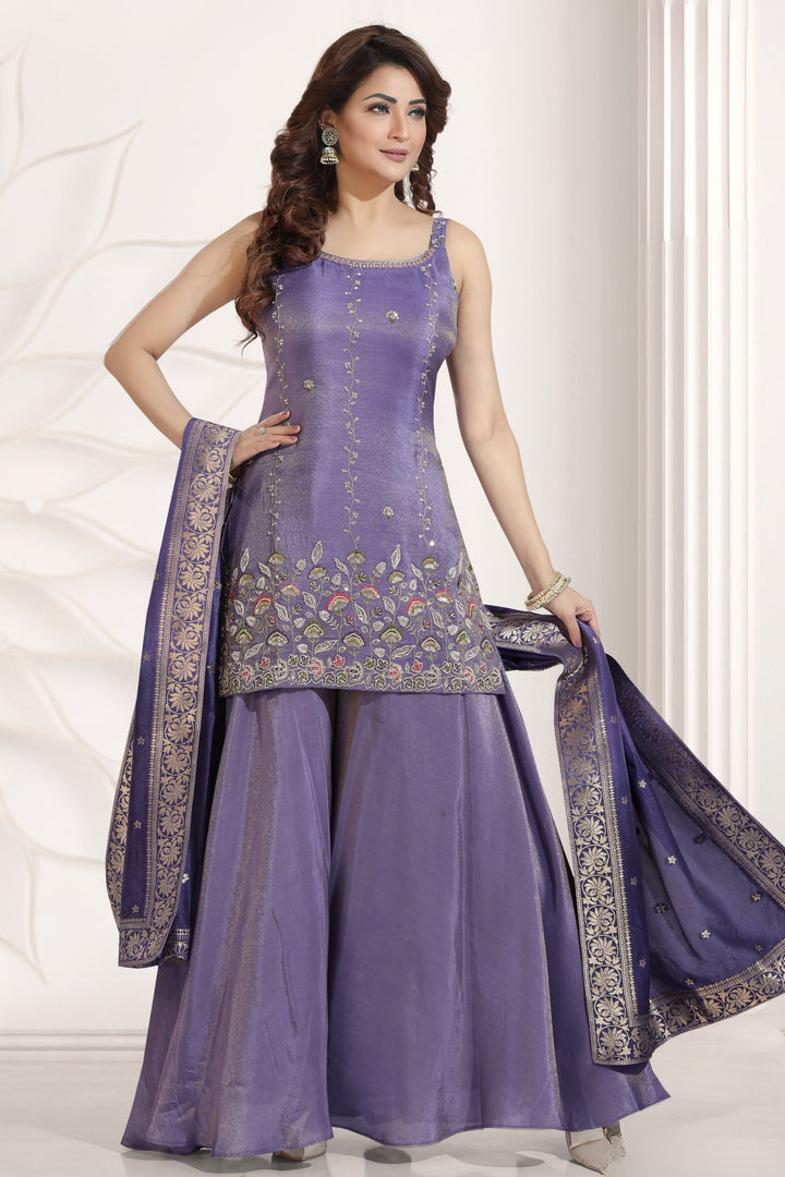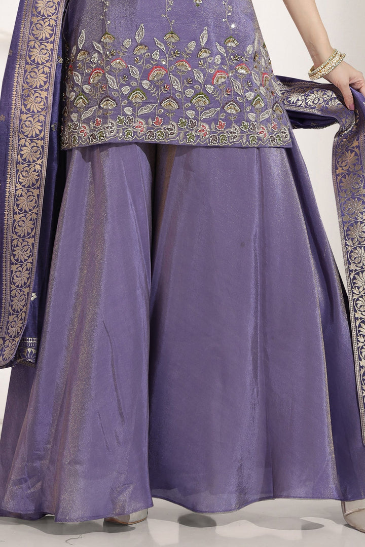 Lavender Sequins, Zardozi, Mirror, Zari and Beads work Palazzo Salwar Suit with Banaras work Dupatta