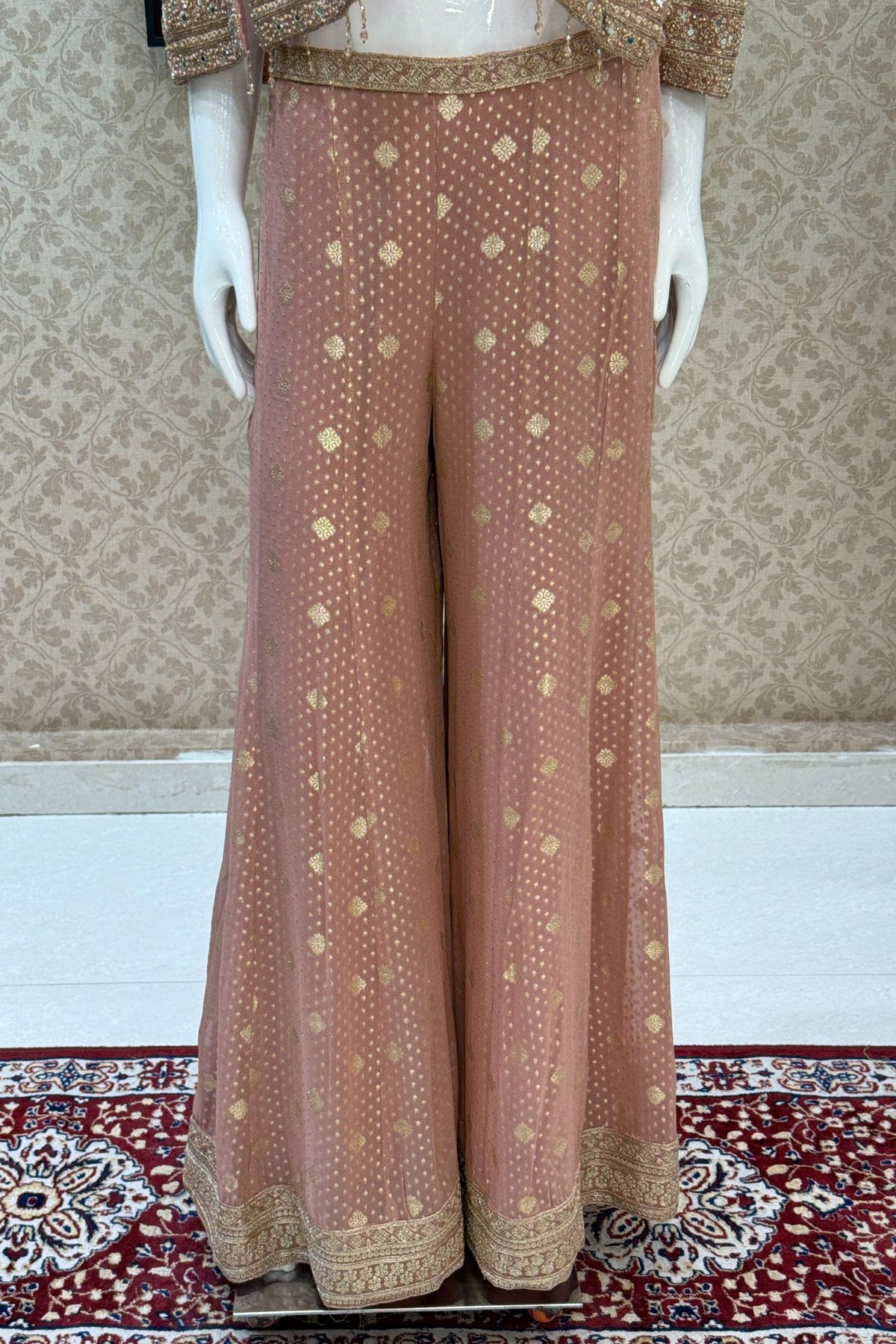 Peach Stone, Zari and Sequins work Crop Top with Overcoat Styled Palazzo Suit Set