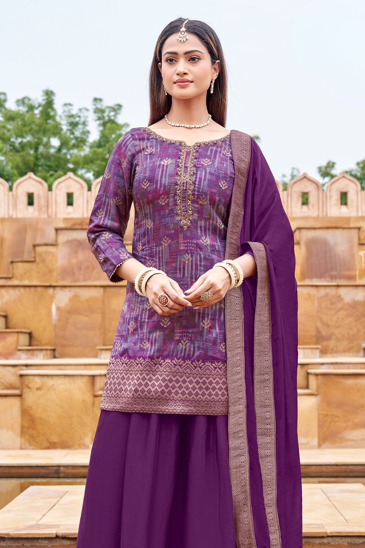 Purple Mirror, Zari, Beads, Stone and Banaras work with Digital Print Palazzo Salwar Suit
