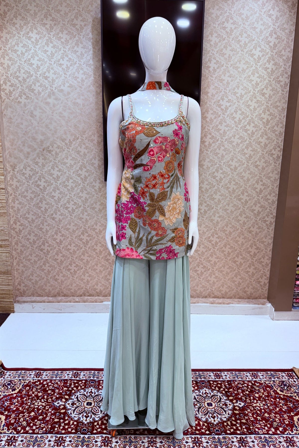 Aqua Blue Mirror, Sequins, Zari and Beads work with Floral Print Palazzo Salwar Suit