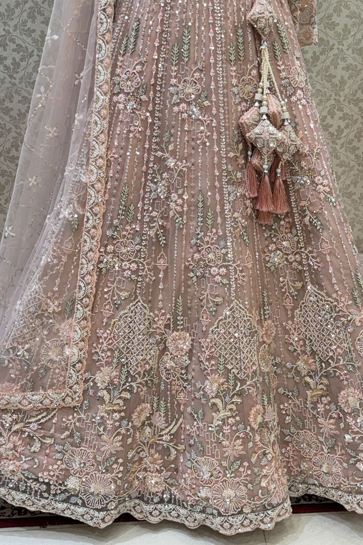 Baby Pink Sequins, Beads and Zari Thread work Crop Top Designer Bridal Lehenga
