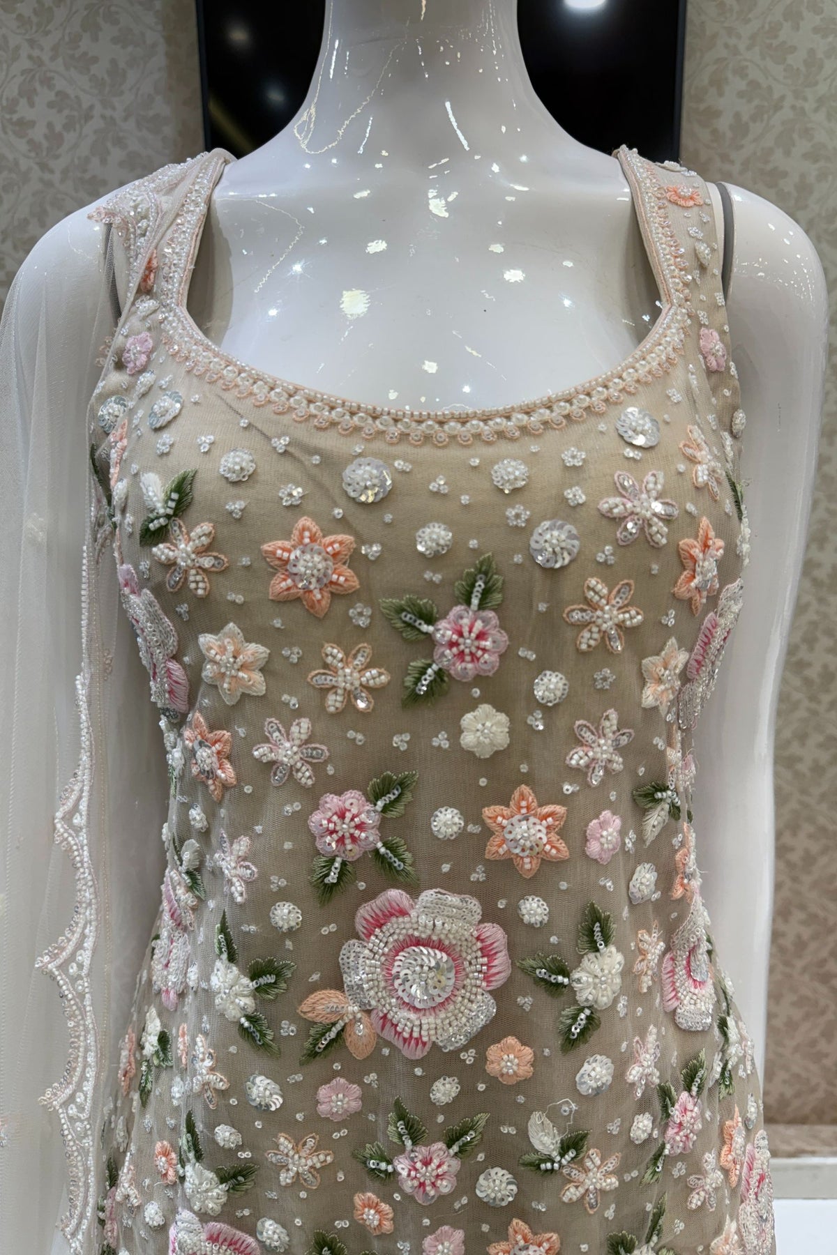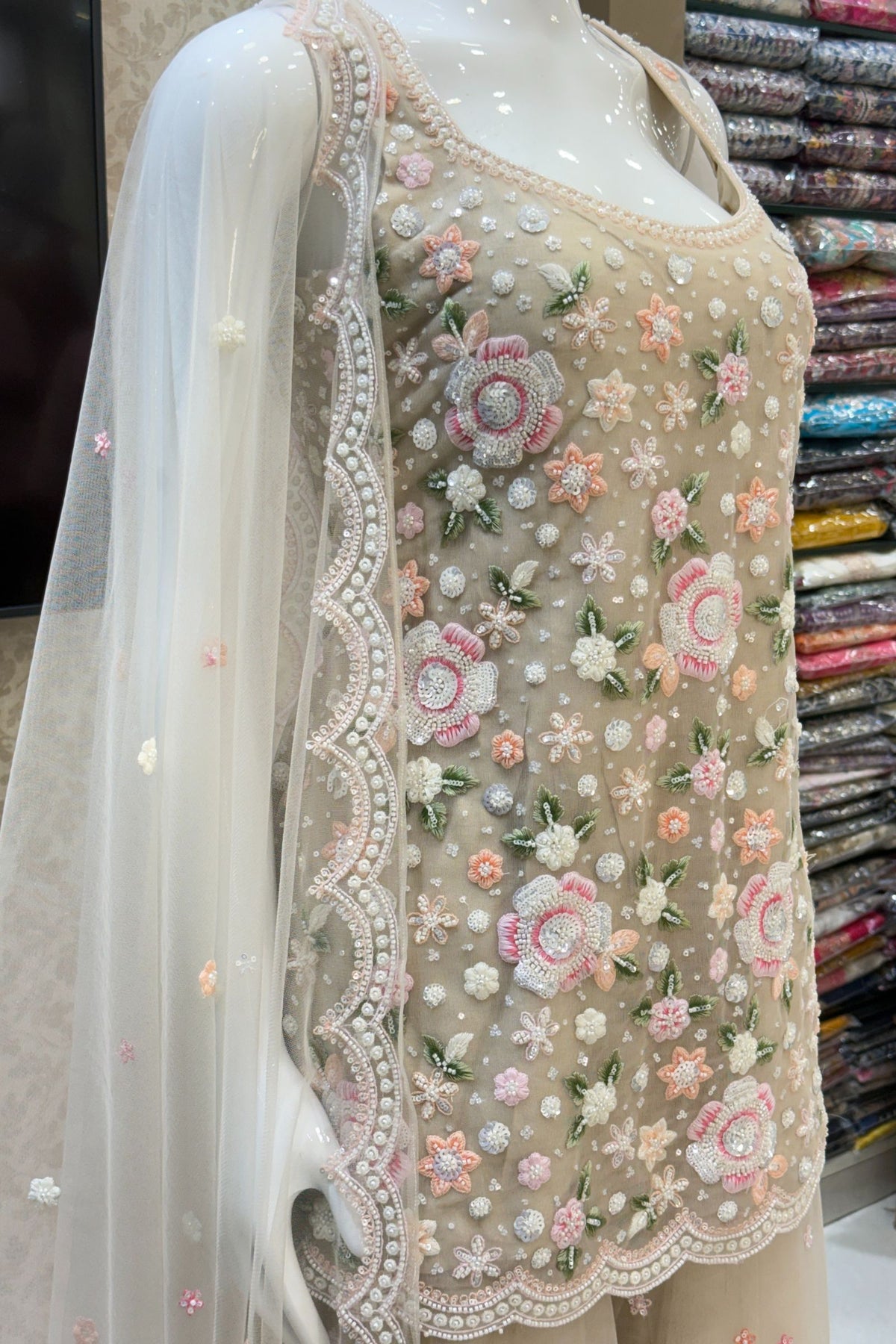 Beige Beads, Sequins and Multicolor Embroidery work Palazzo Salwar Suit