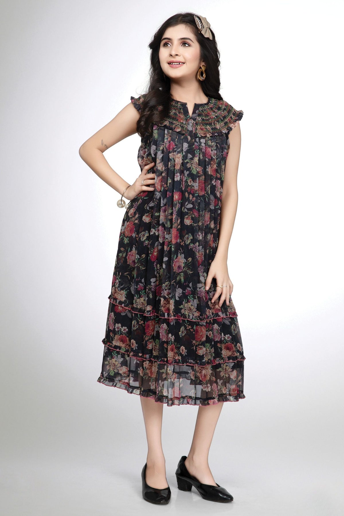Black with Floral Print and Multicolor Thread work Knee Length Casual Frock for Girls