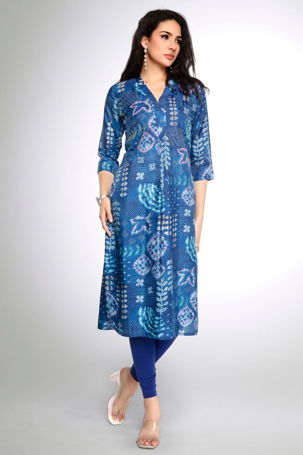 Blue with Digital Print, Beads and Sequins work Calf Length Kurti