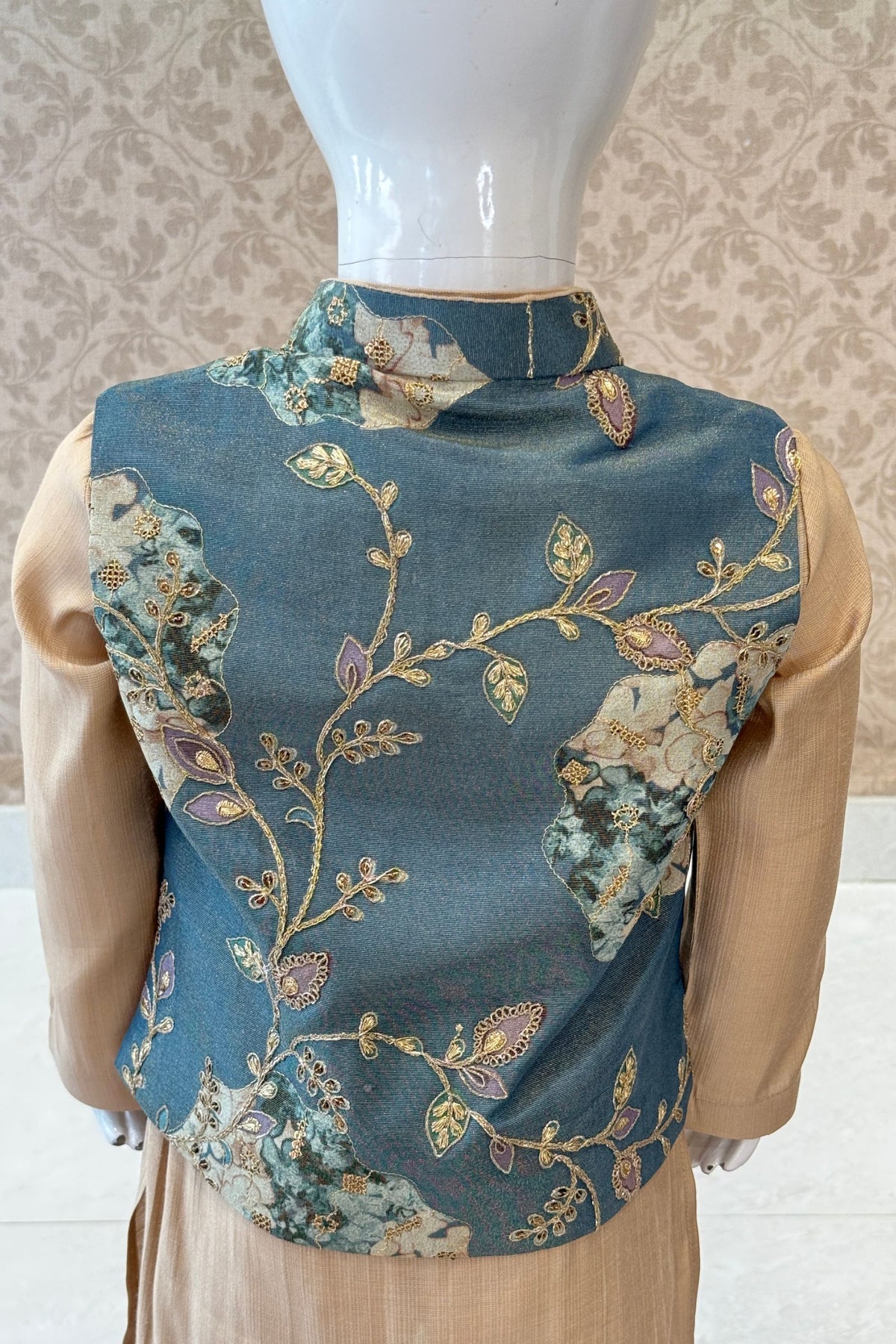 Blue with Gold Zari and Sequins work Waist Coat Kurta Set for Boys