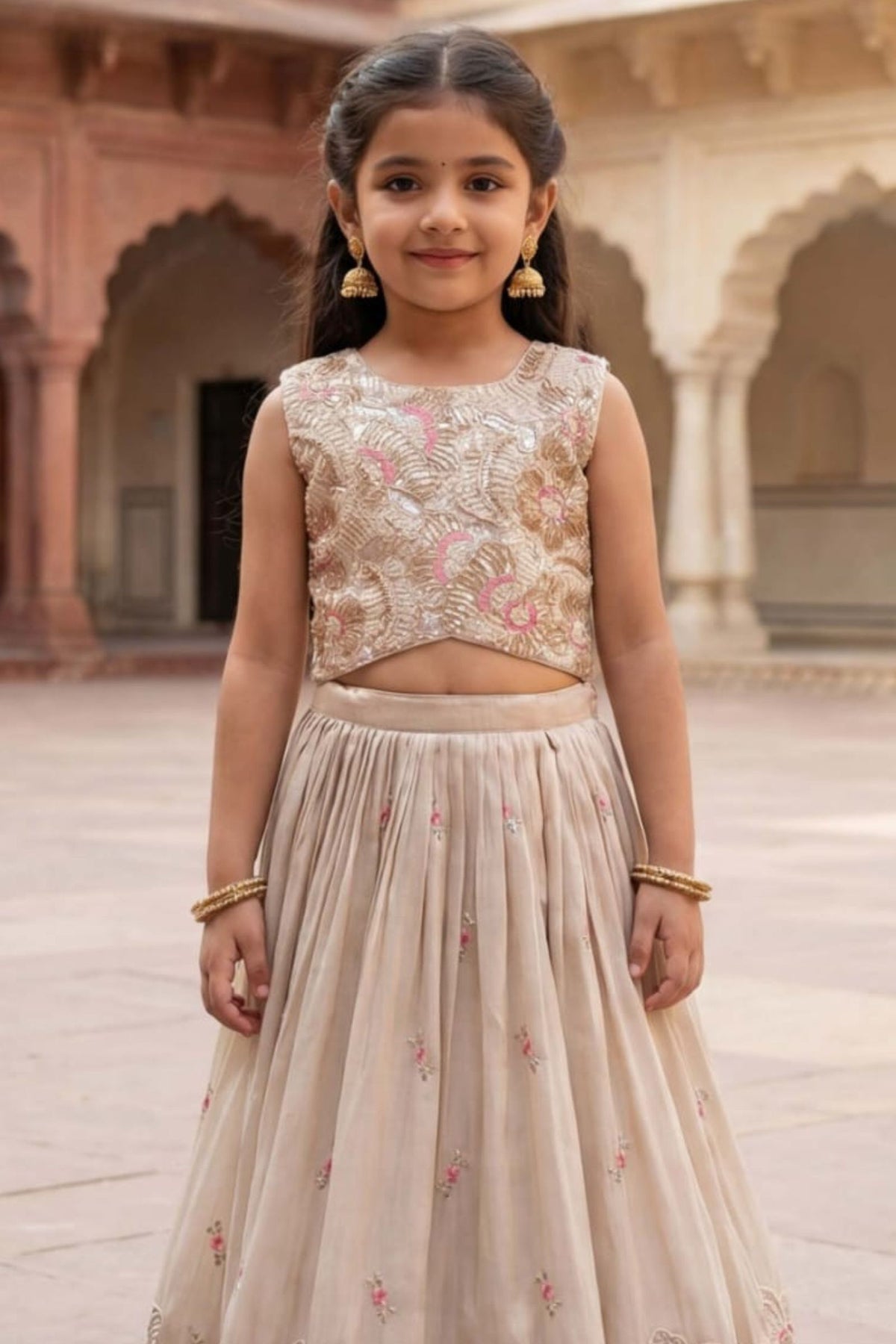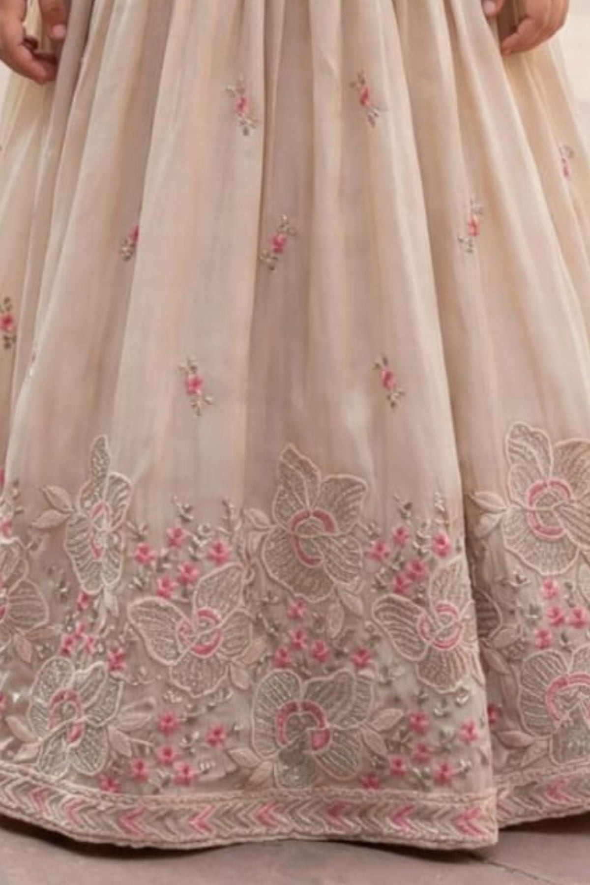 Cream Beads, Pearl, Thread, Zari and Sequins work Lehenga Choli for Girls