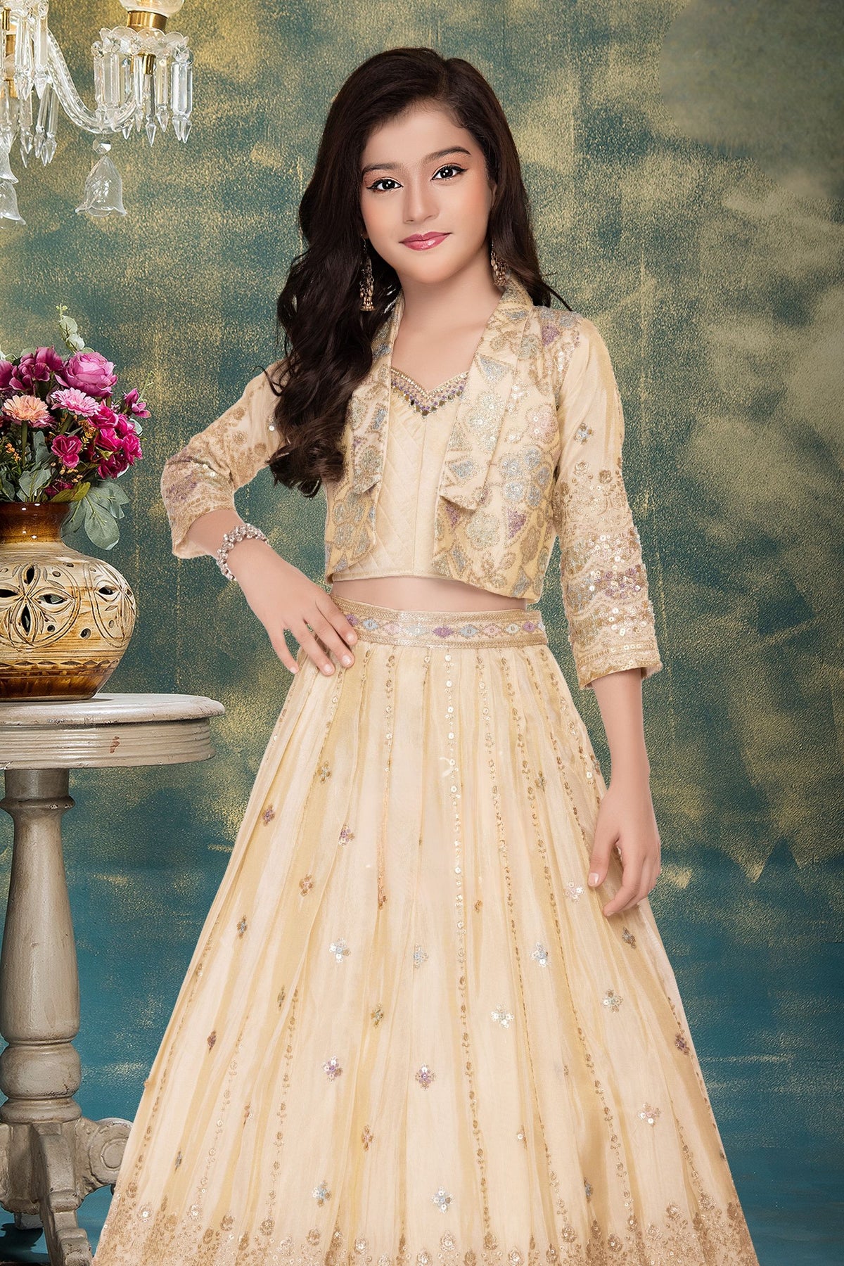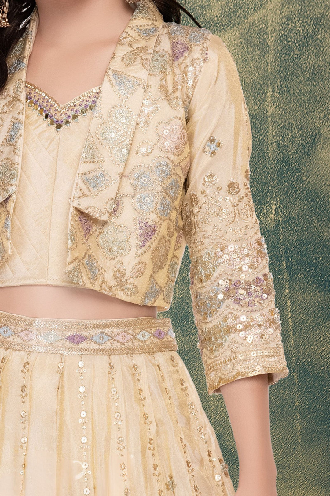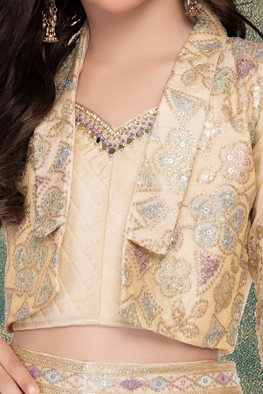 Cream Mirror, Sequins and Multicolor Thread work Jacket Styled Lehenga Choli for Girls
