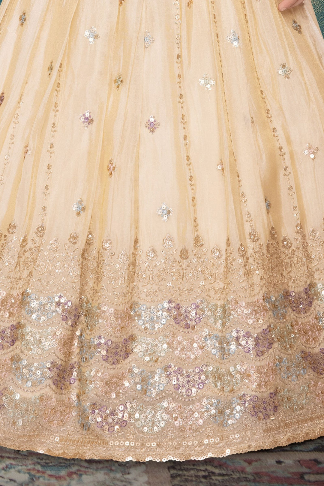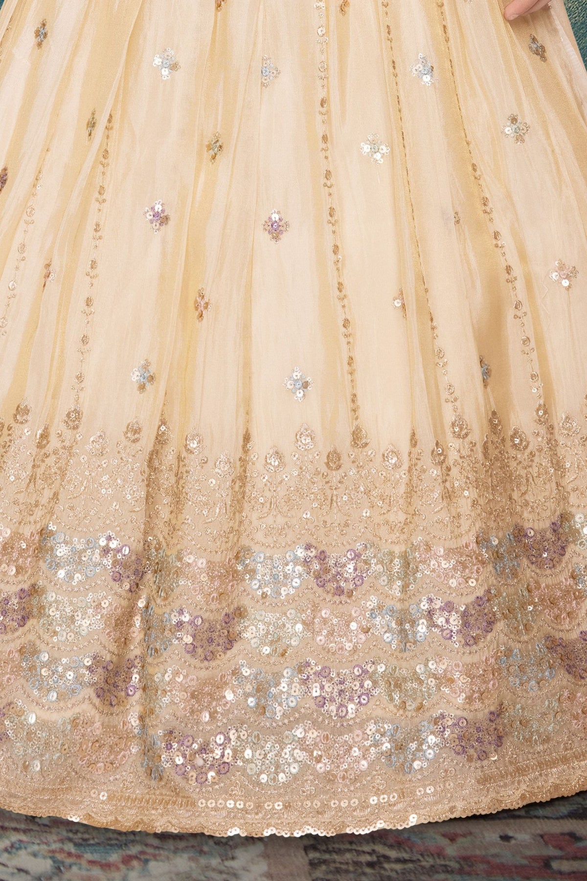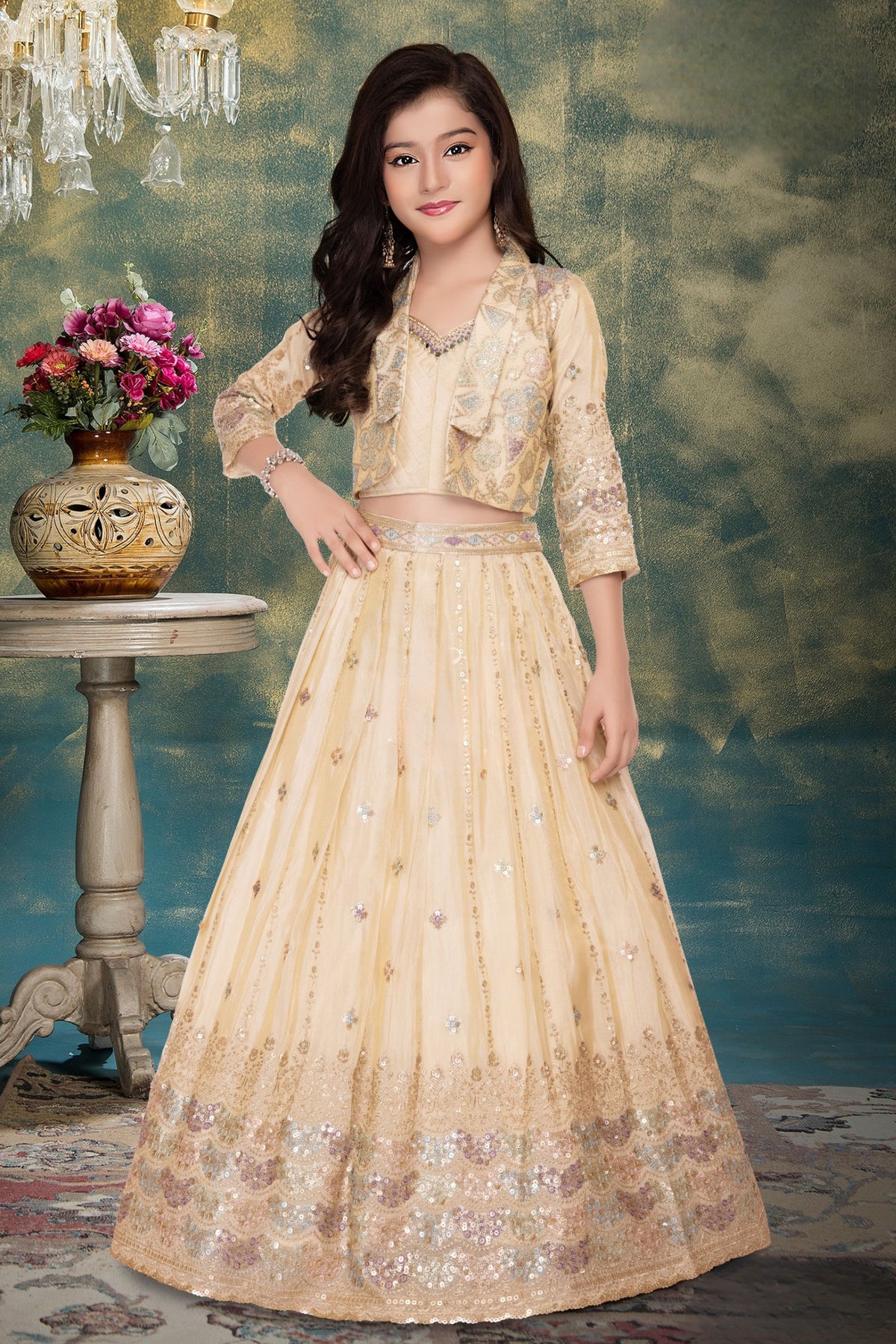 Cream Mirror, Sequins and Multicolor Thread work Jacket Styled Lehenga Choli for Girls