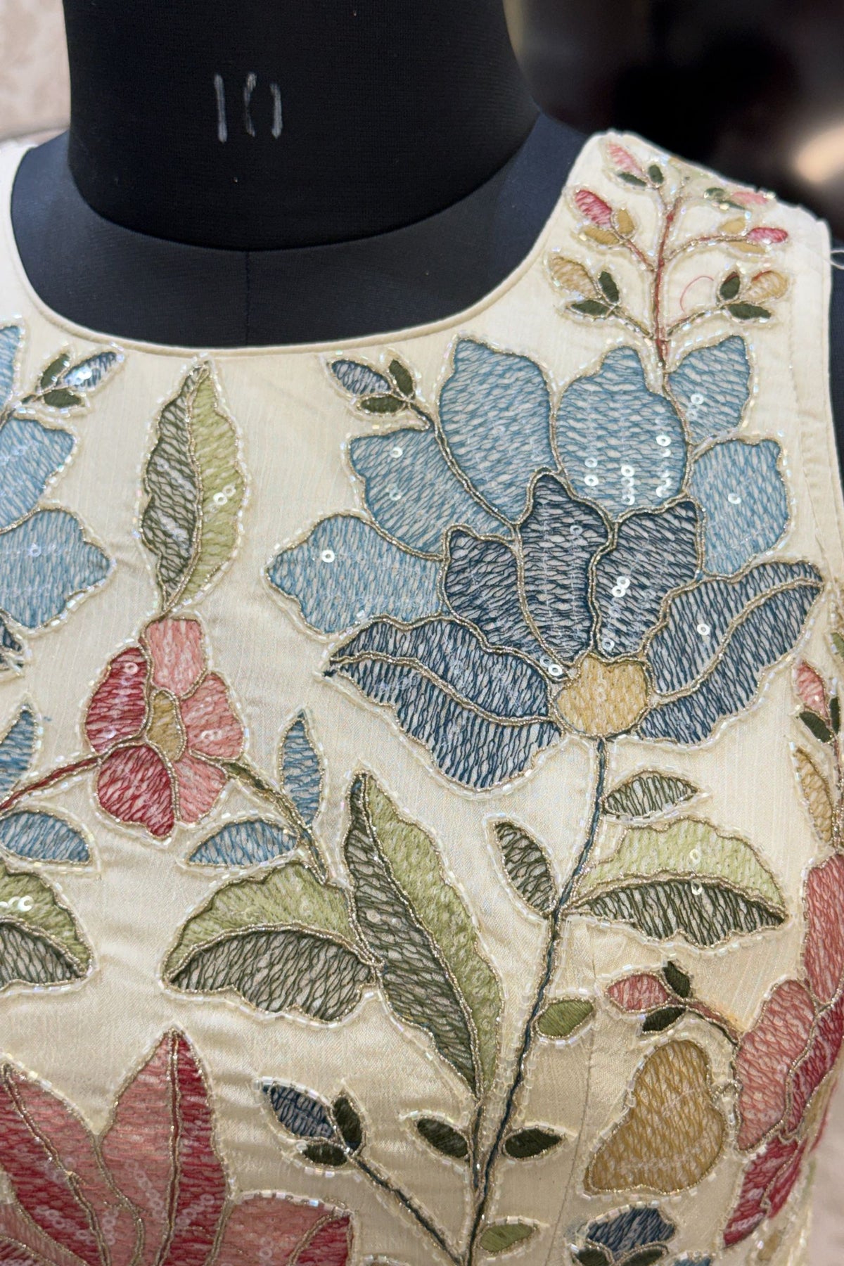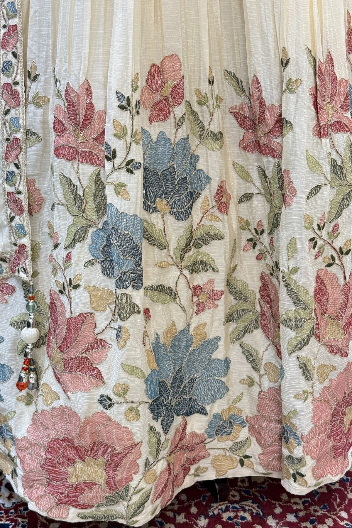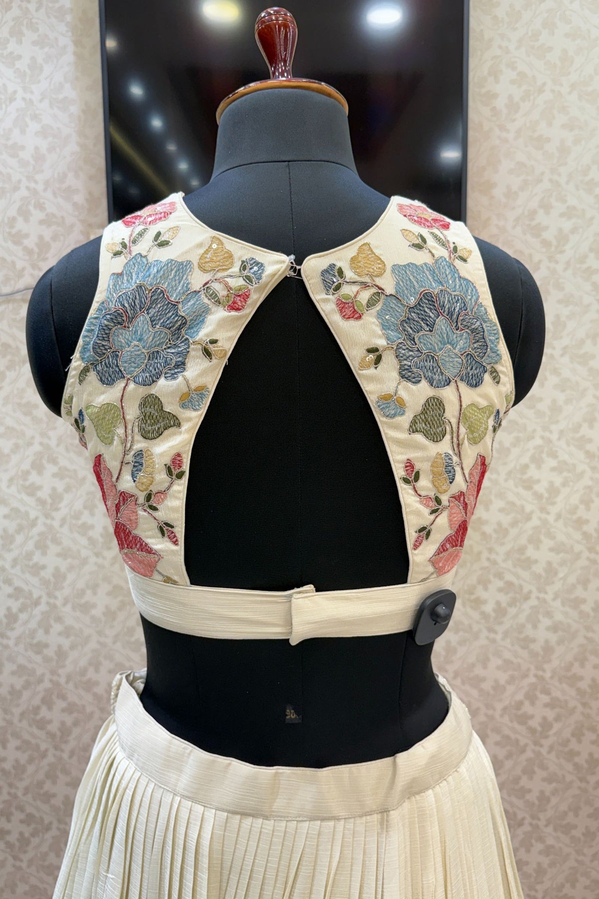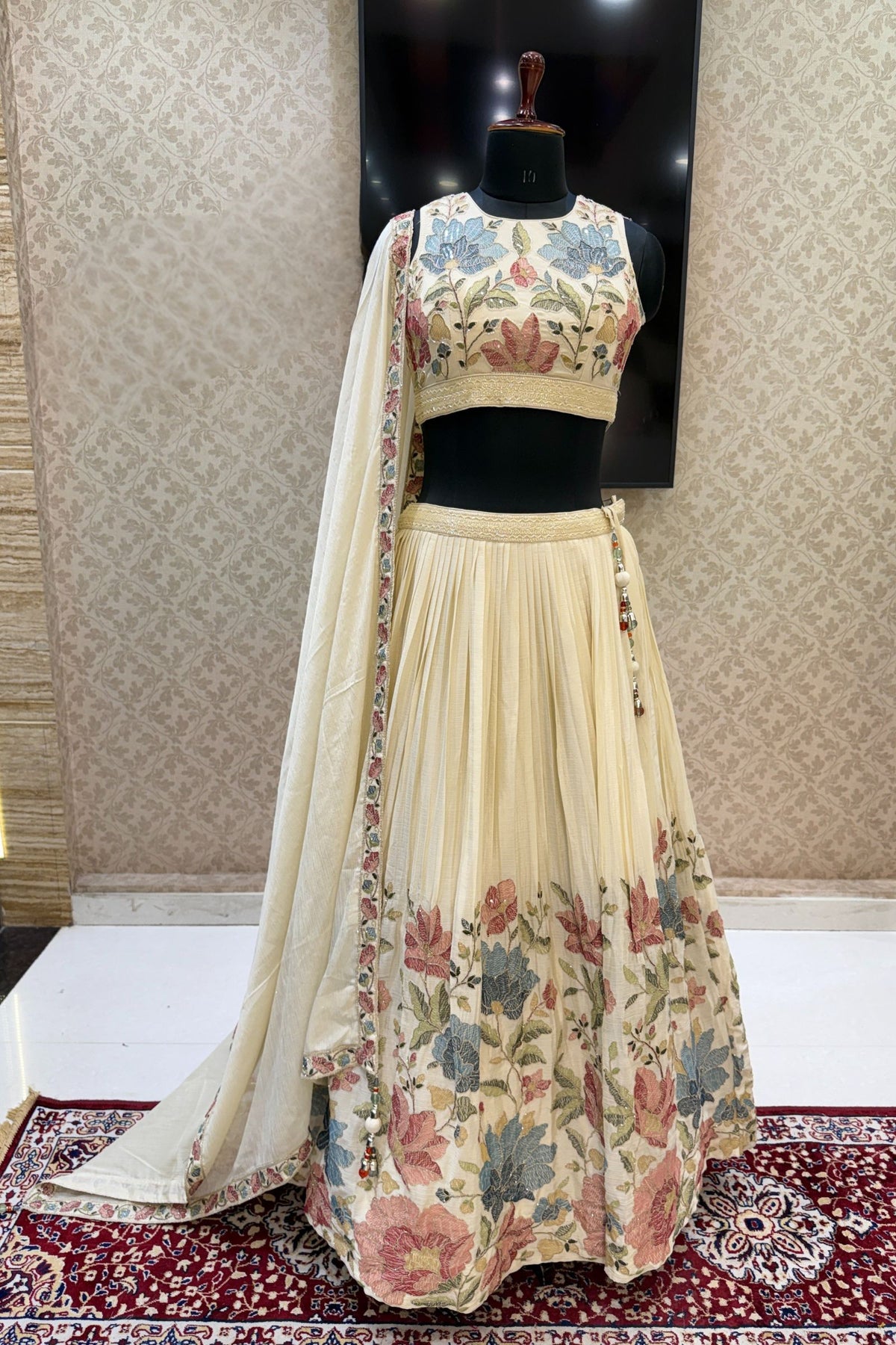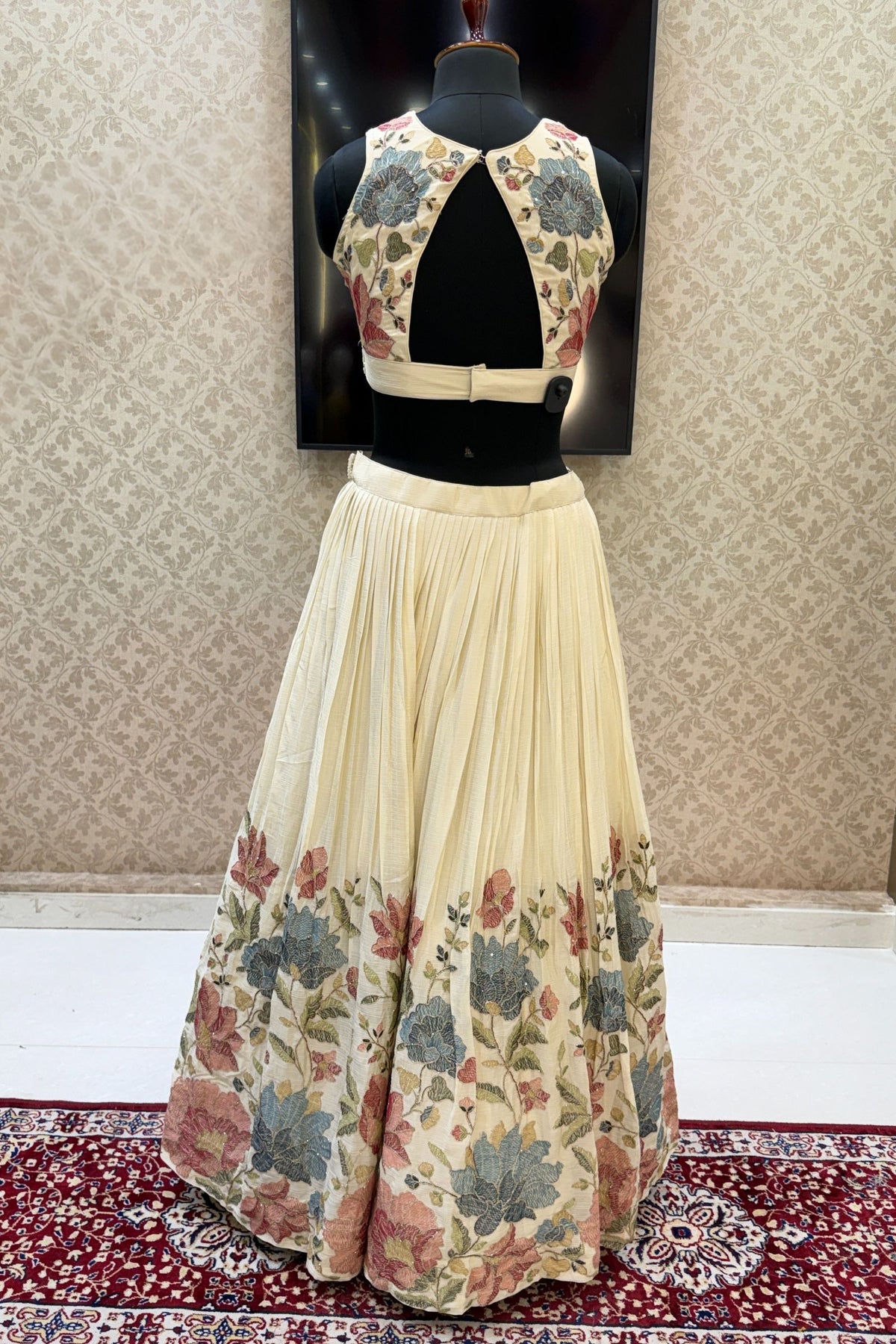 Cream Multicolor Thread, Beads, Zari Thread and Sequins work Crop Top Lehenga