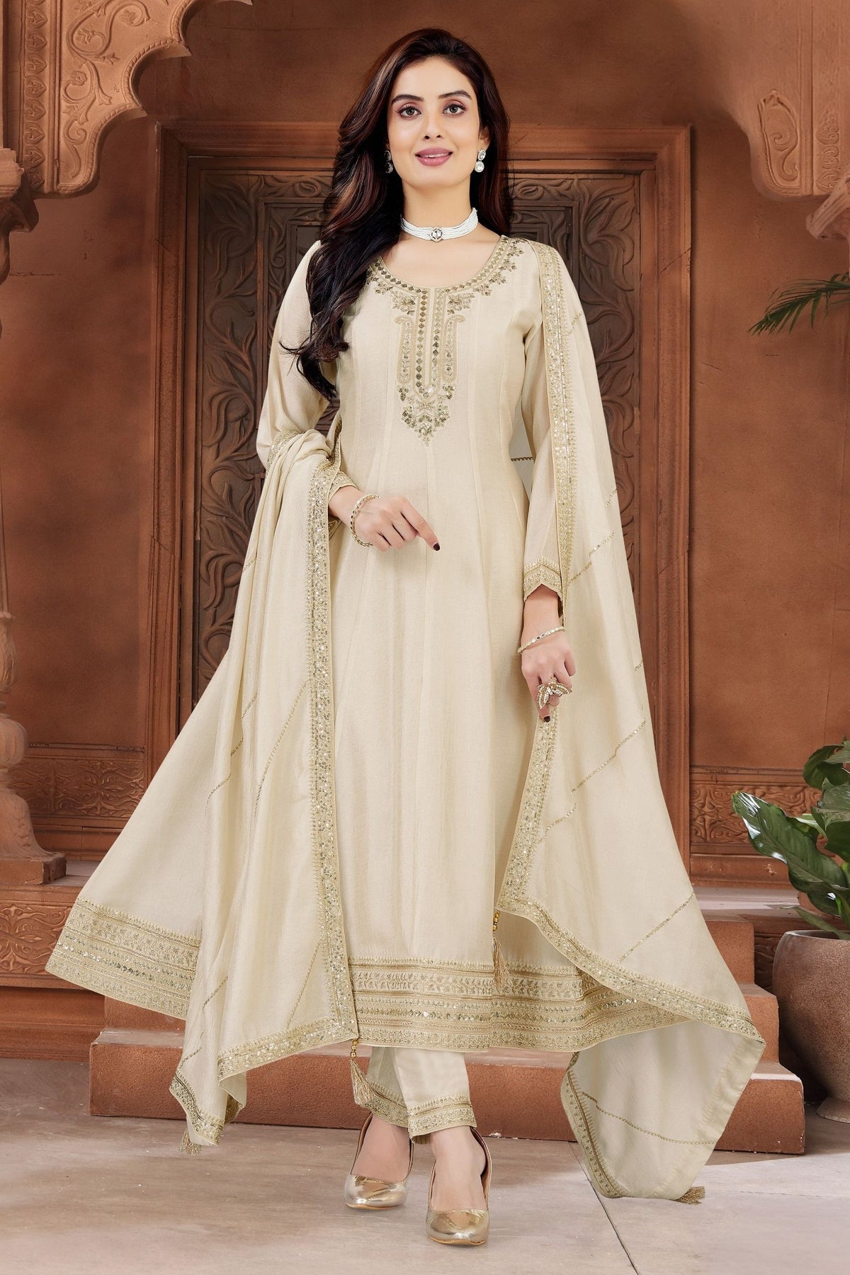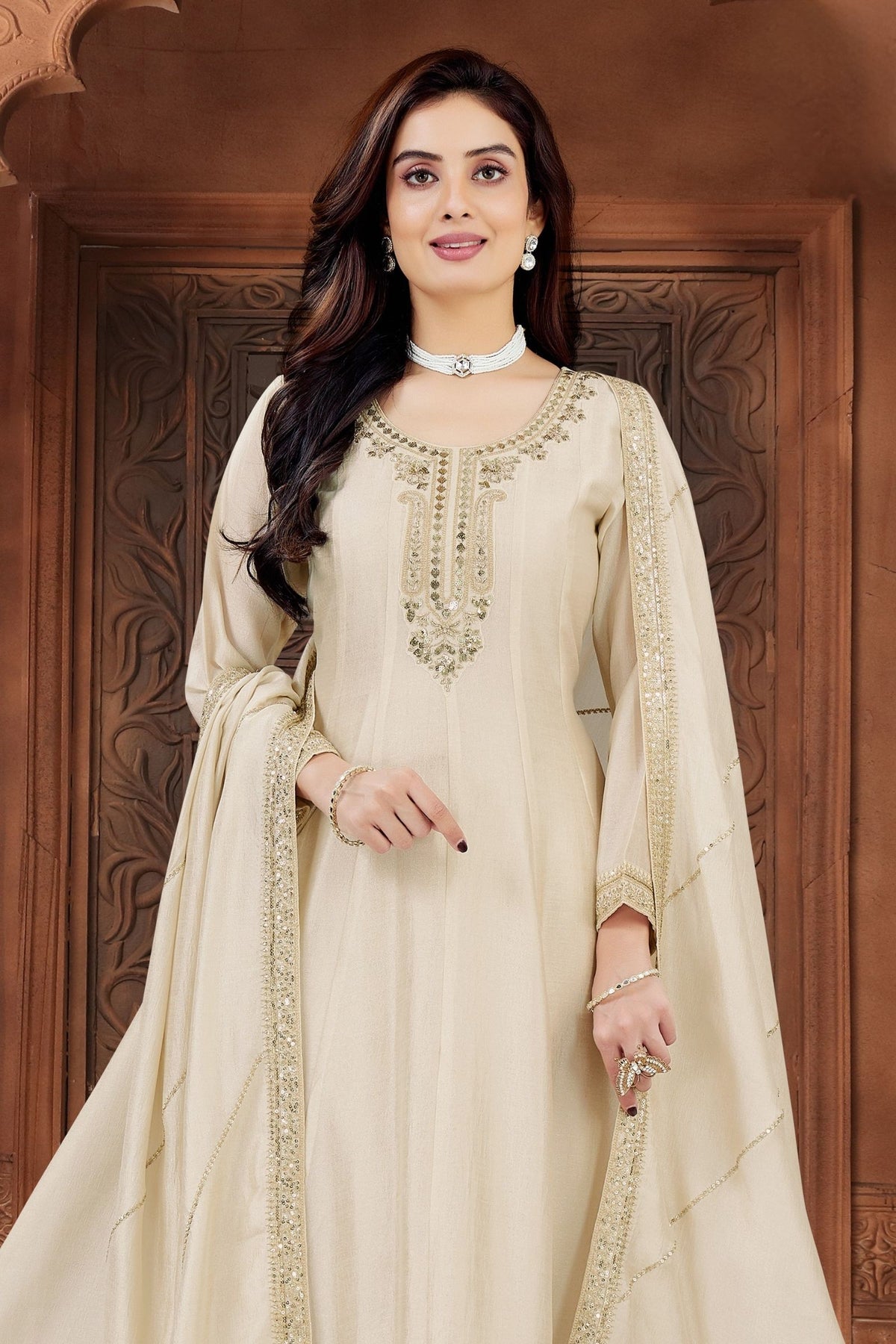 Cream Sequins, Beads and Zari work Anarkali Style Salwar