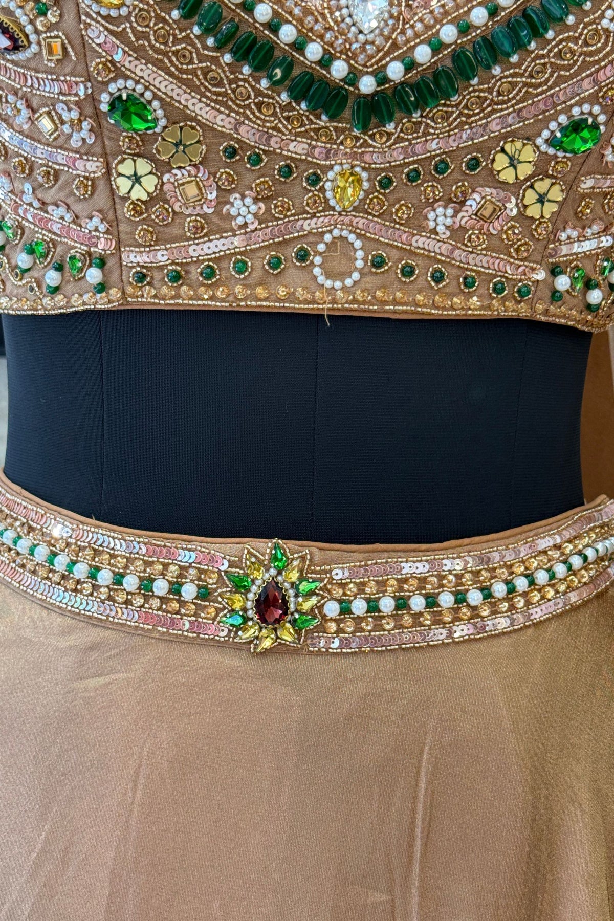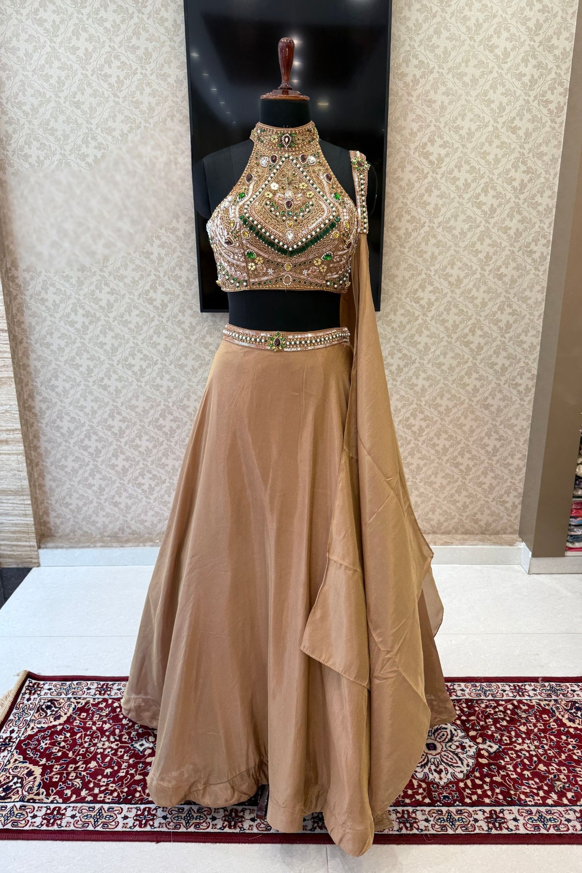 Gold Beads, Zardozi, Stone, Sequins and Pearl work with Halter Neck Crop Top Lehenga