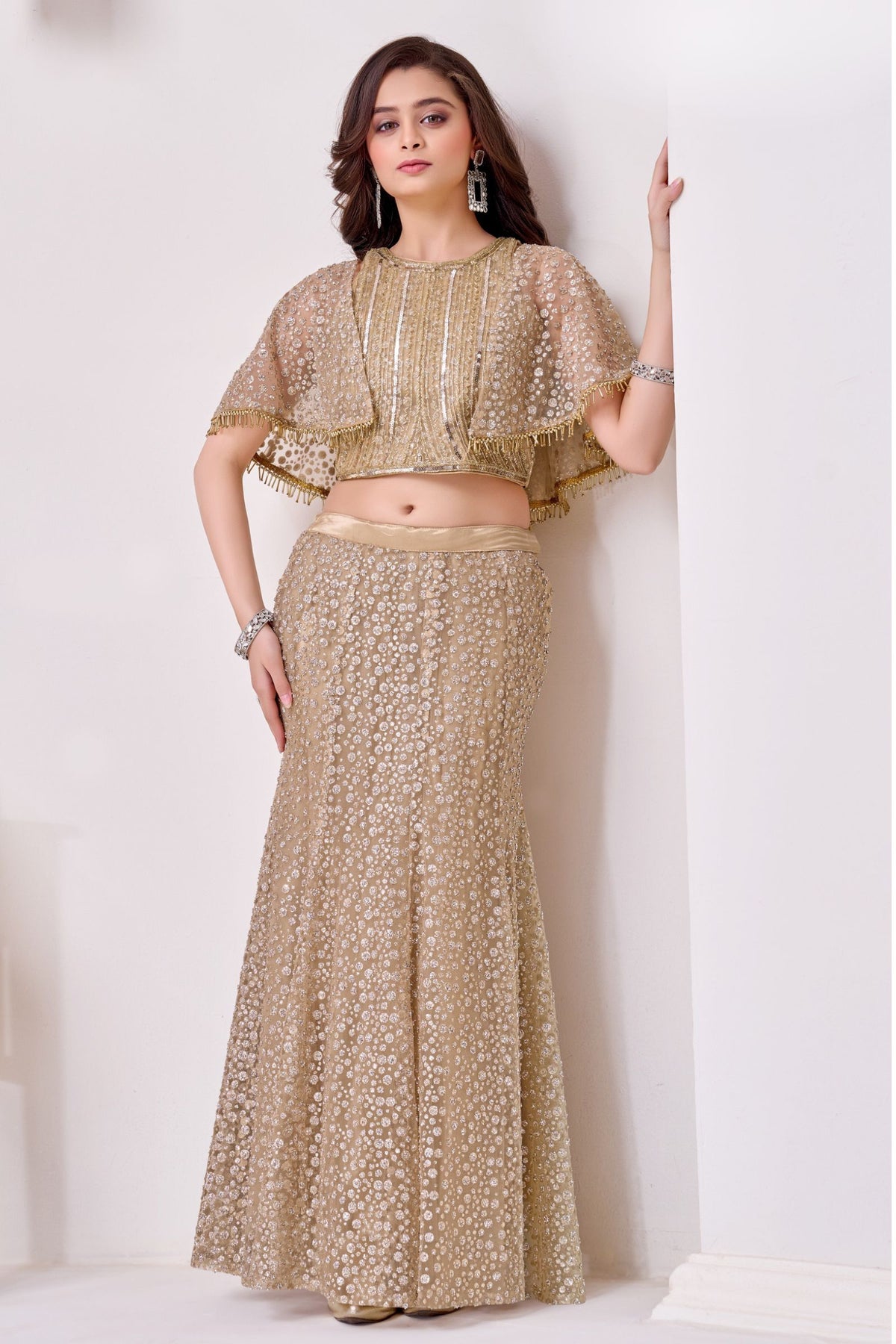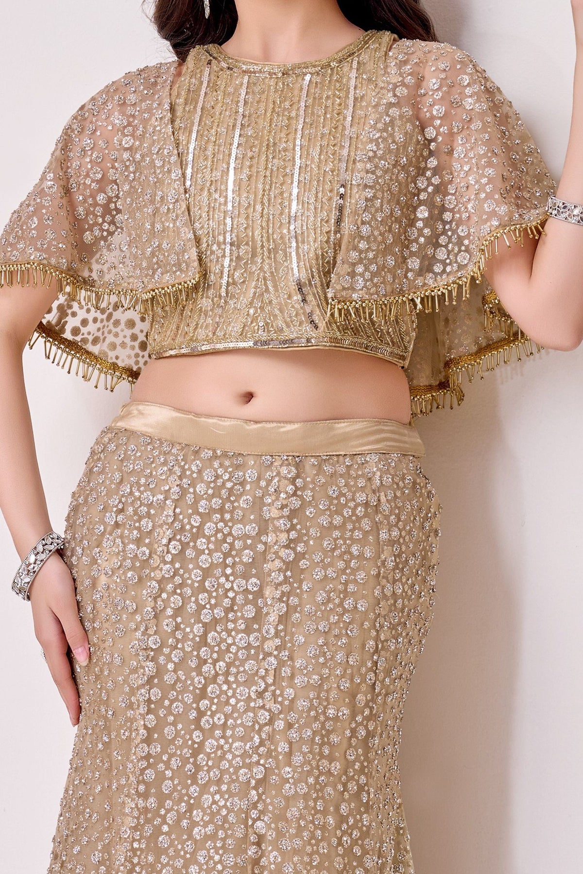 Gold with Poncho Beads and Sequins work Indo-Western Styled Lehenga Choli for Girls