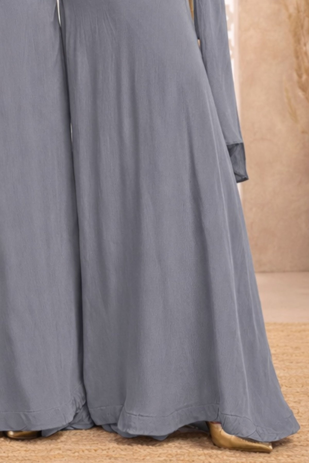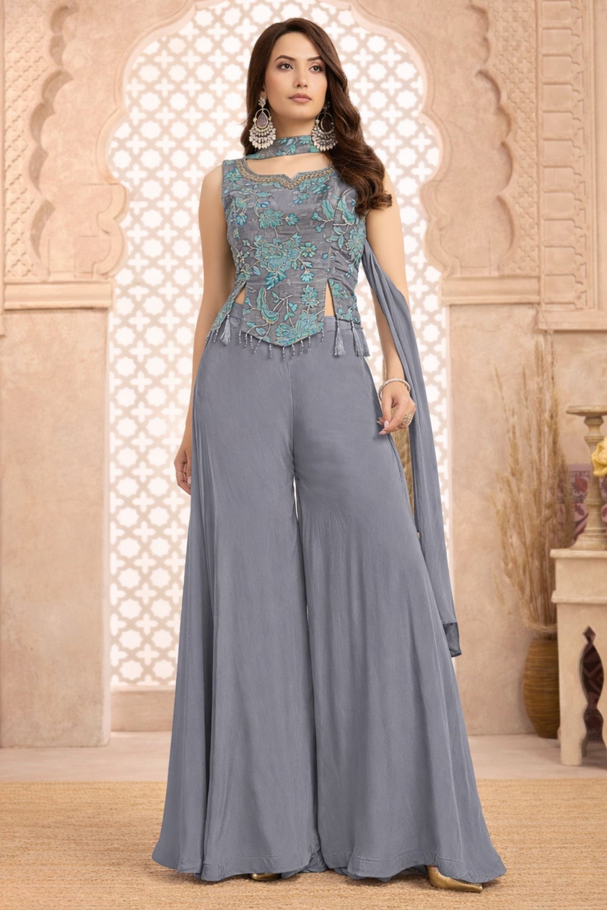 Grey Zari, Sequins, Beads and Mirror work with Floral Print Palazzo Suit Set