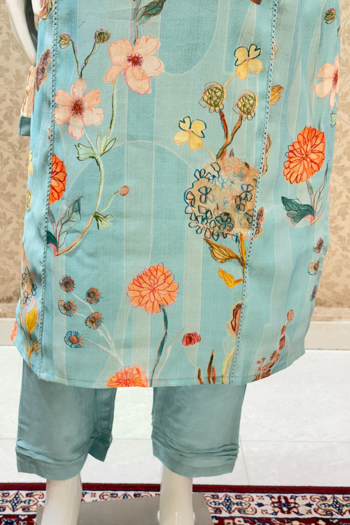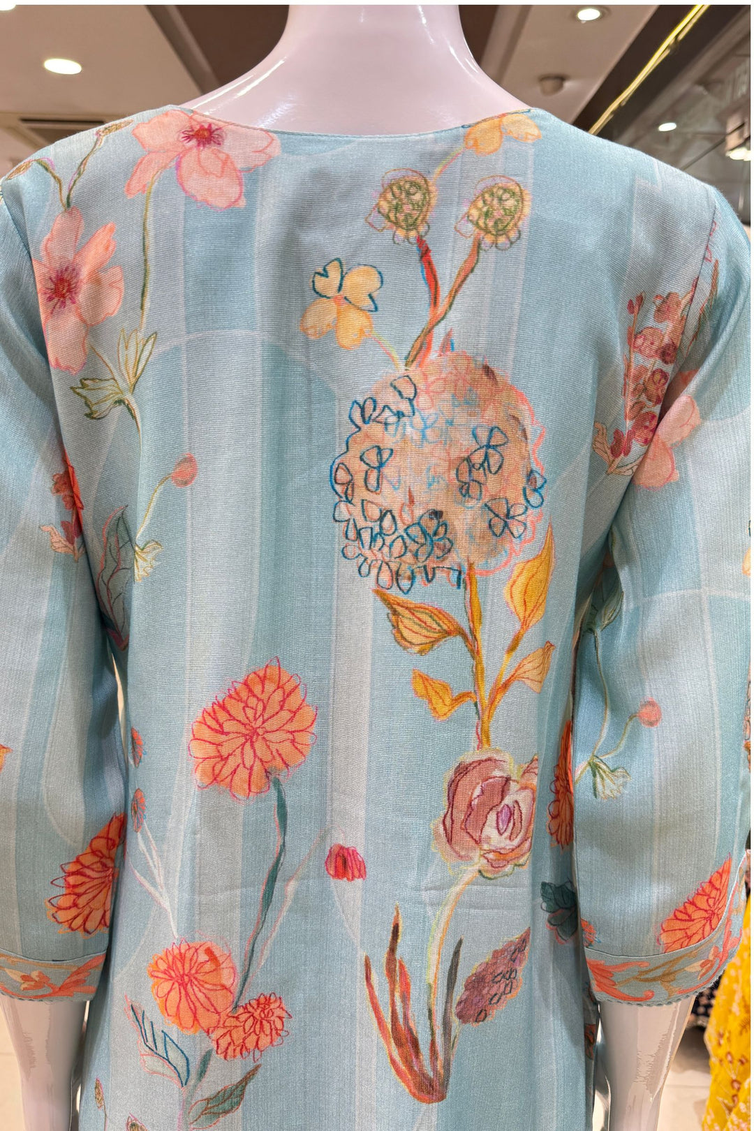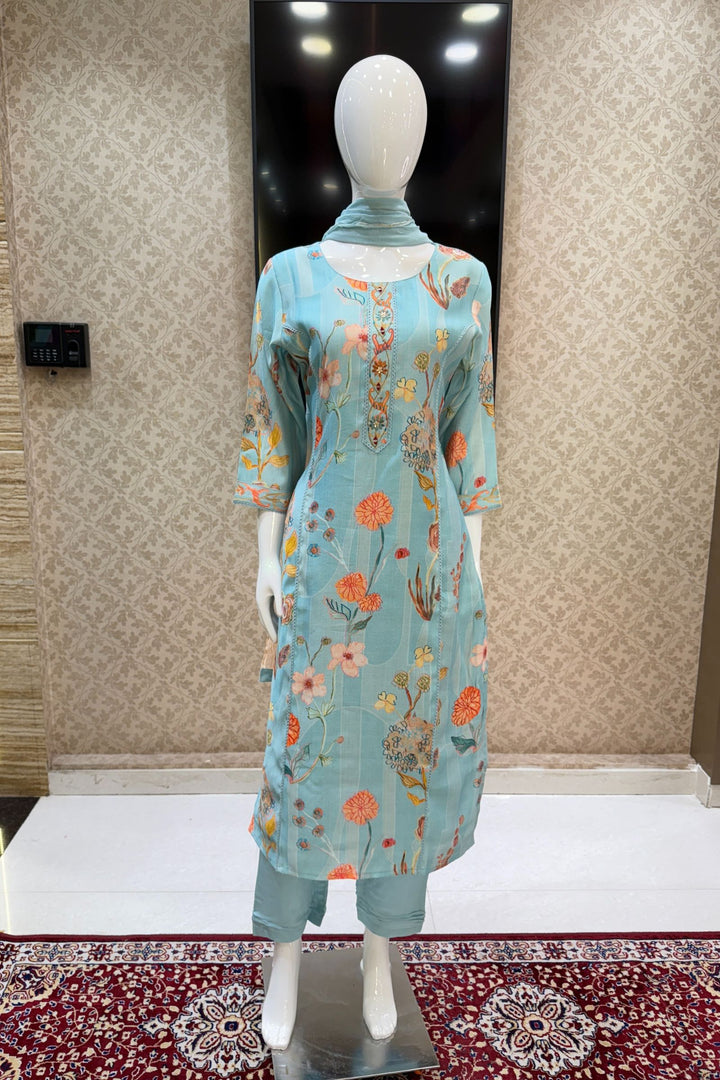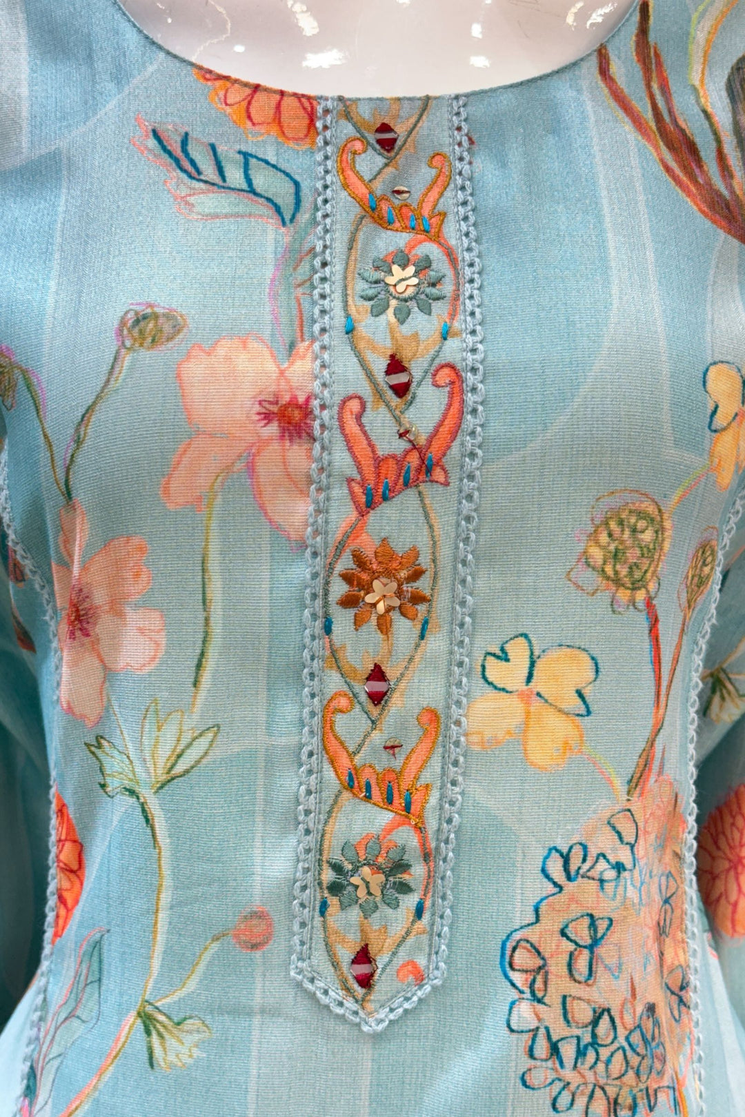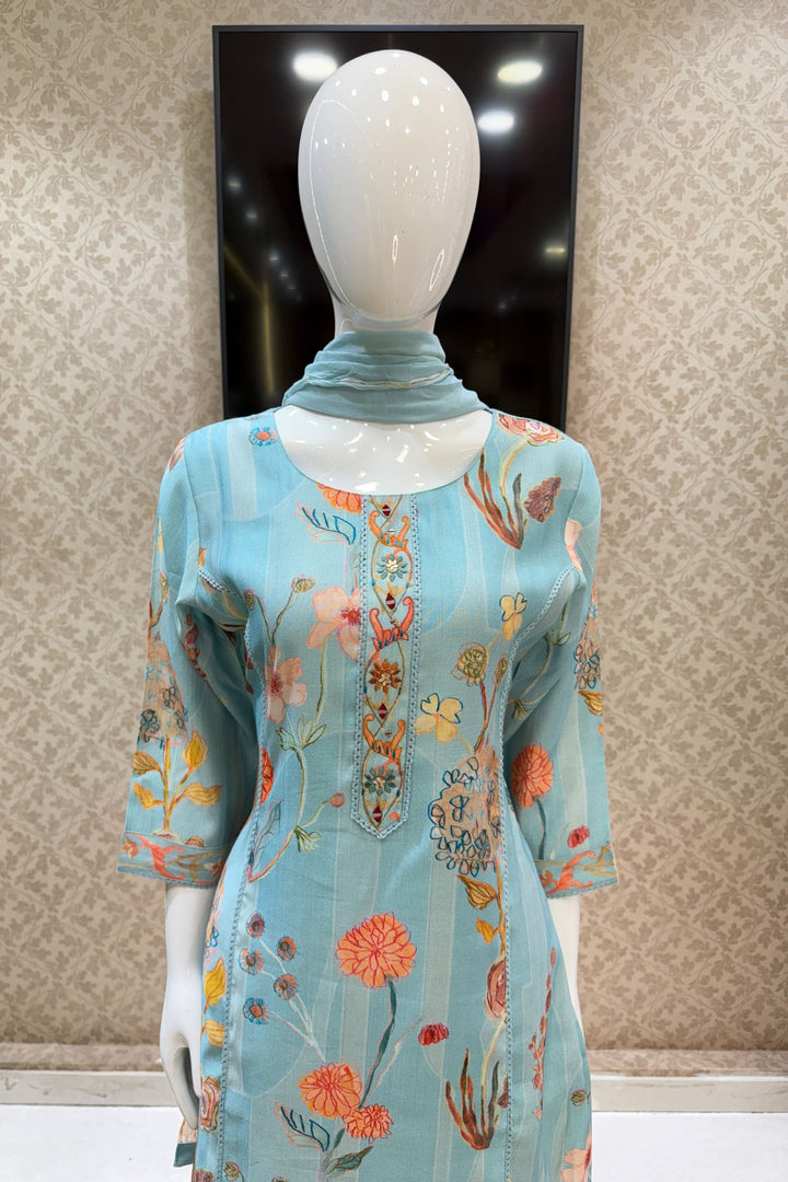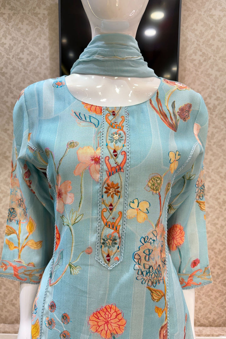 Light Blue Mirror and Thread work with Floral Print Straight Cut Salwar Suit