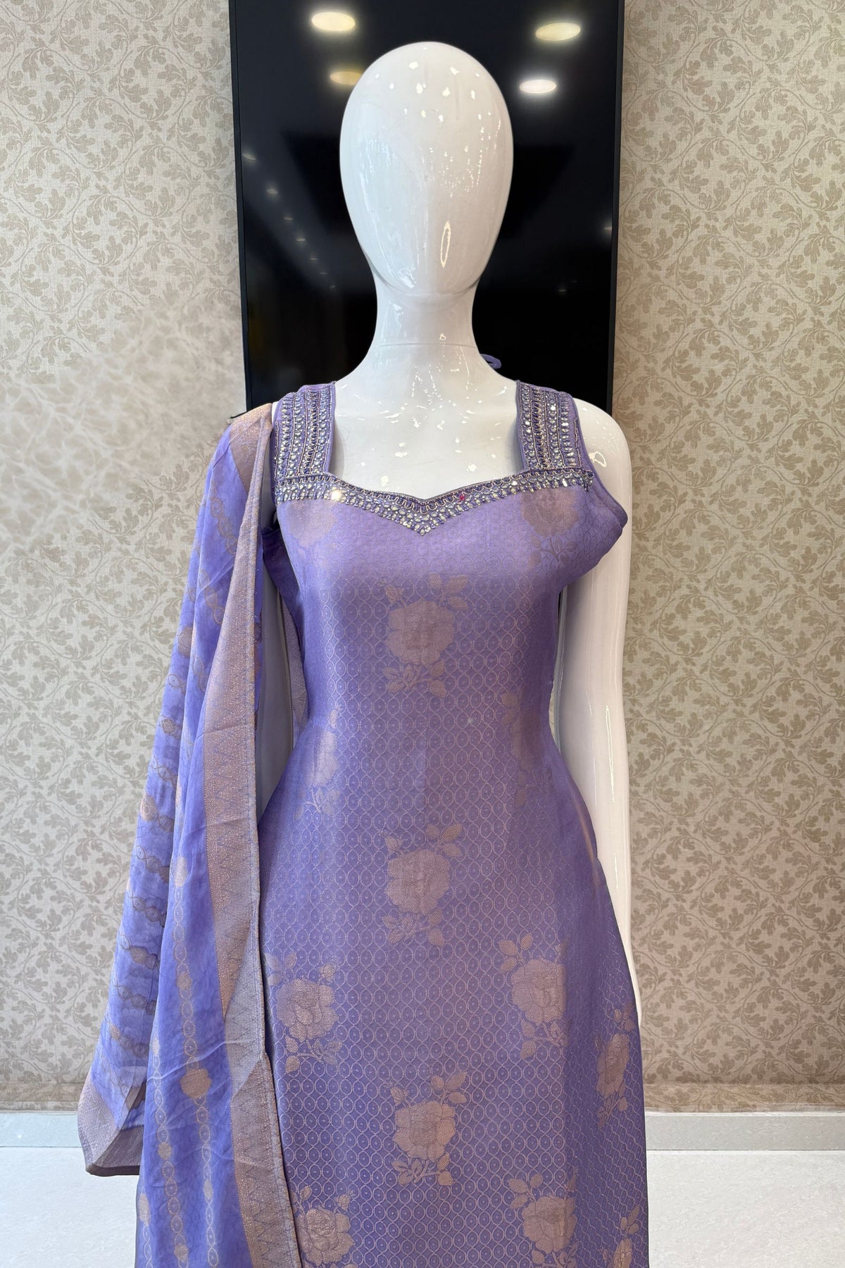 Lilac Banaras, Mirror, Zardozi, Beads, Stone and Sequins work Straight Cut Salwar Suit