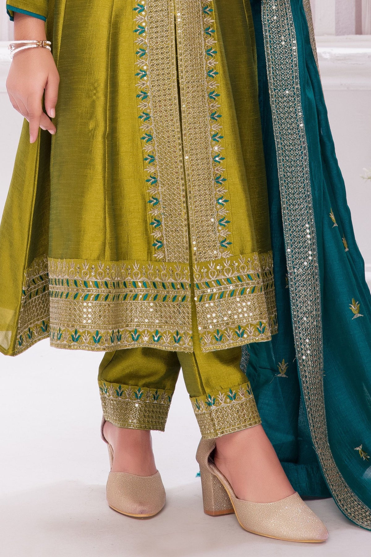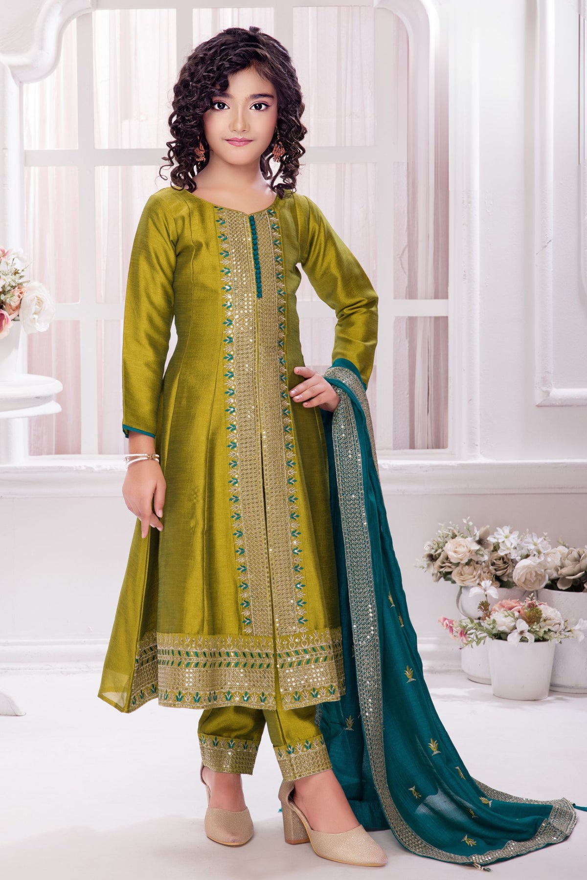Olive Green Sequins and Zari work Salwar Suit for Girls