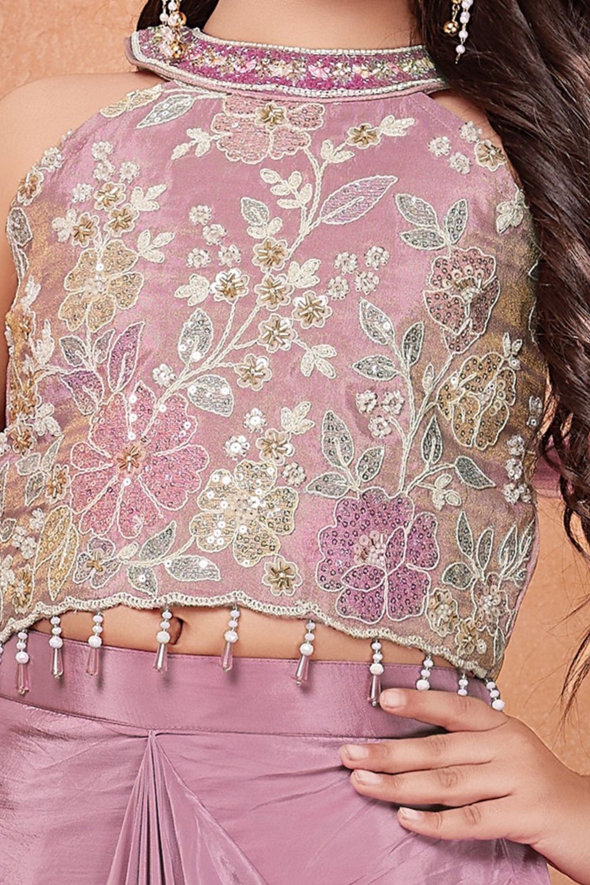 Onion Pink Beads, Sequins and Multicolor Thread work Choli with Cowl Skirt for Girls