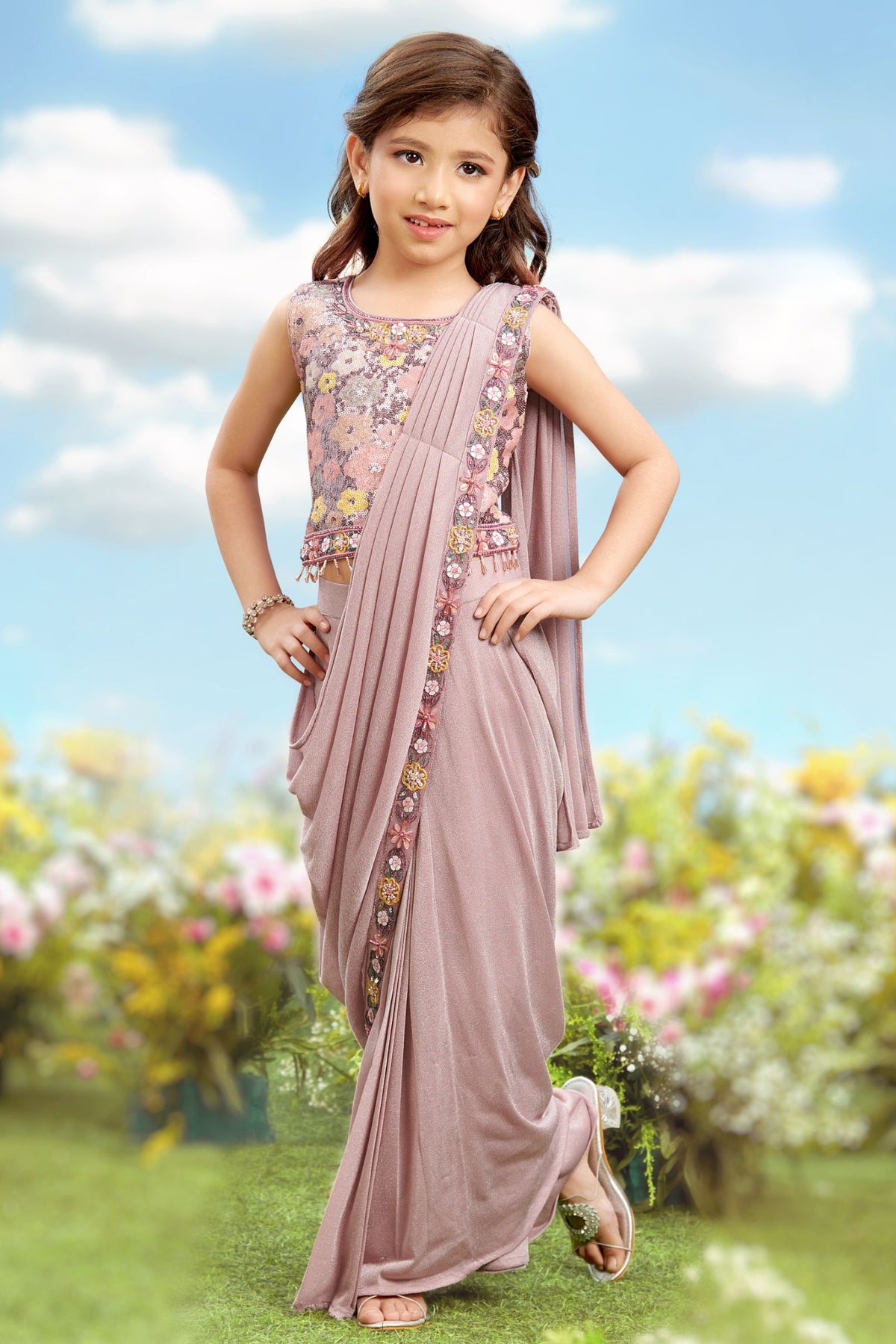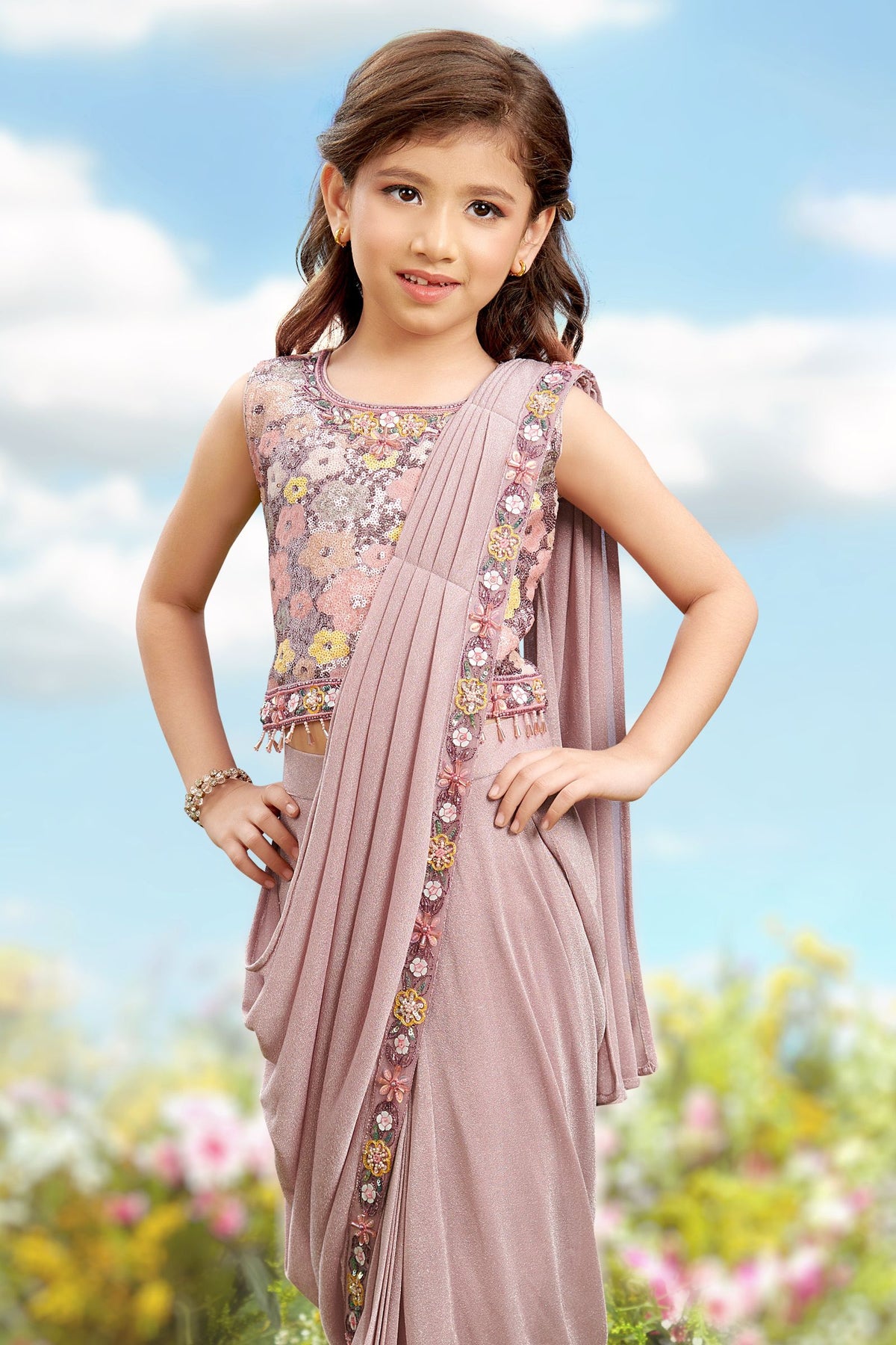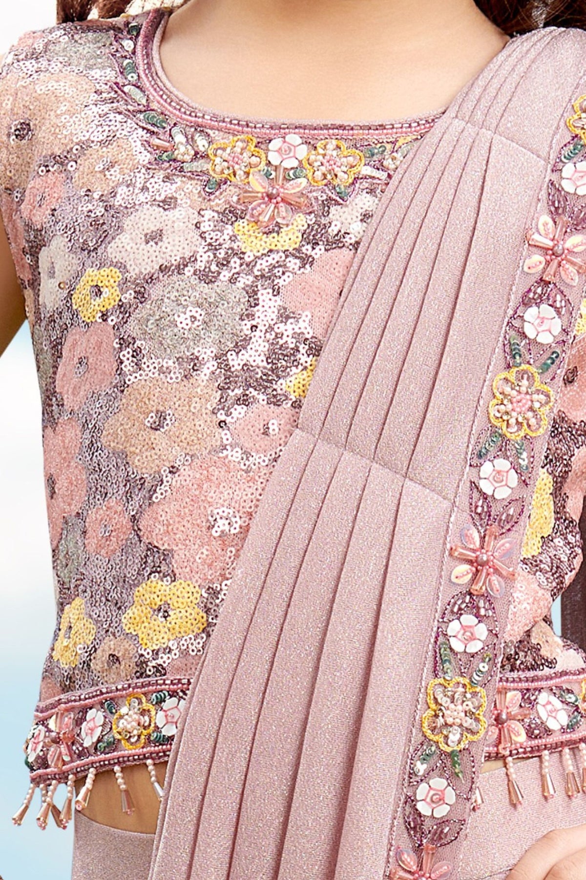 Onion Pink Multicolor Sequins work Saree Styled Lehenga for Girls
