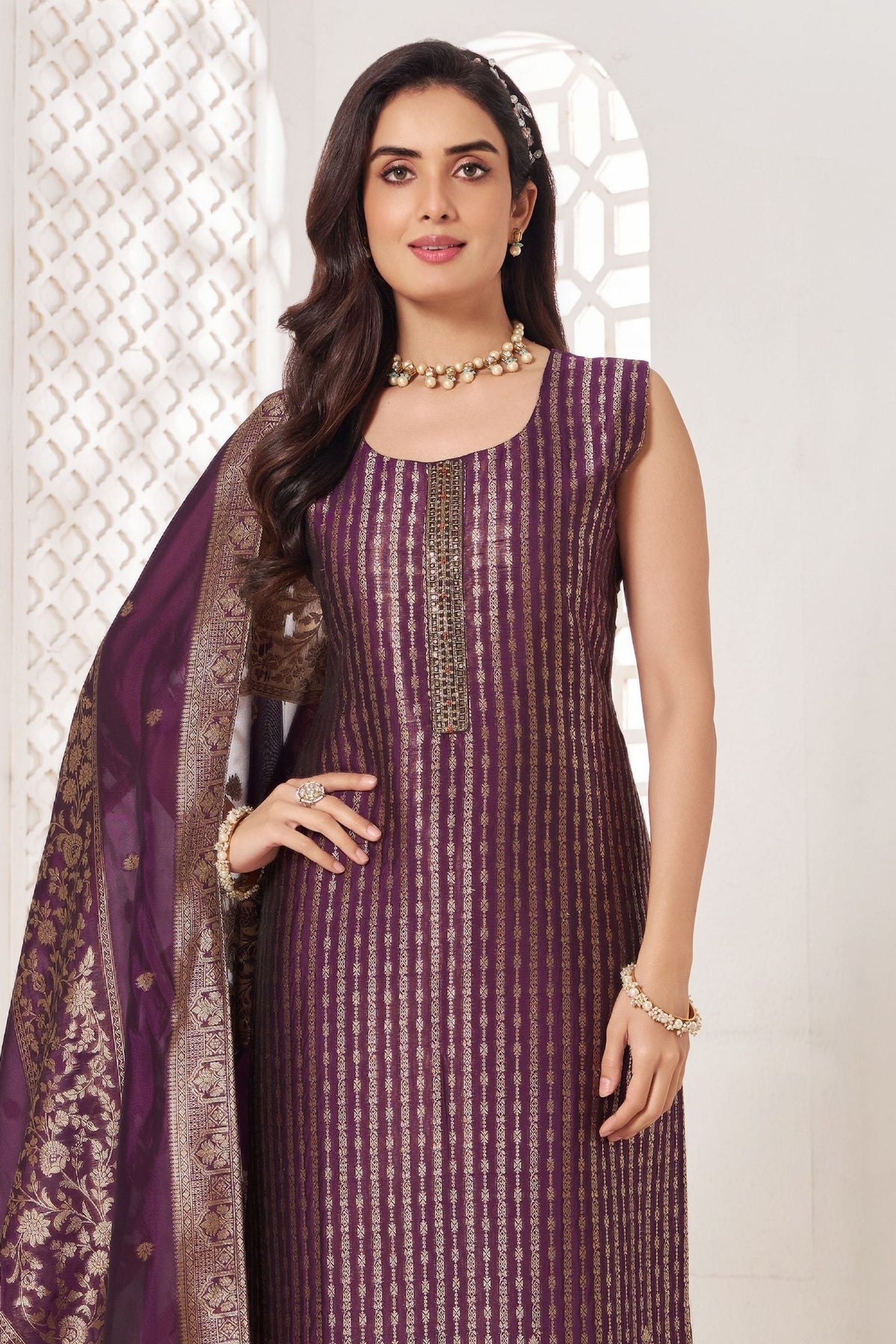 Purple Banaras, Zardozi, Beads and Stone work Straight Cut Salwar Suit