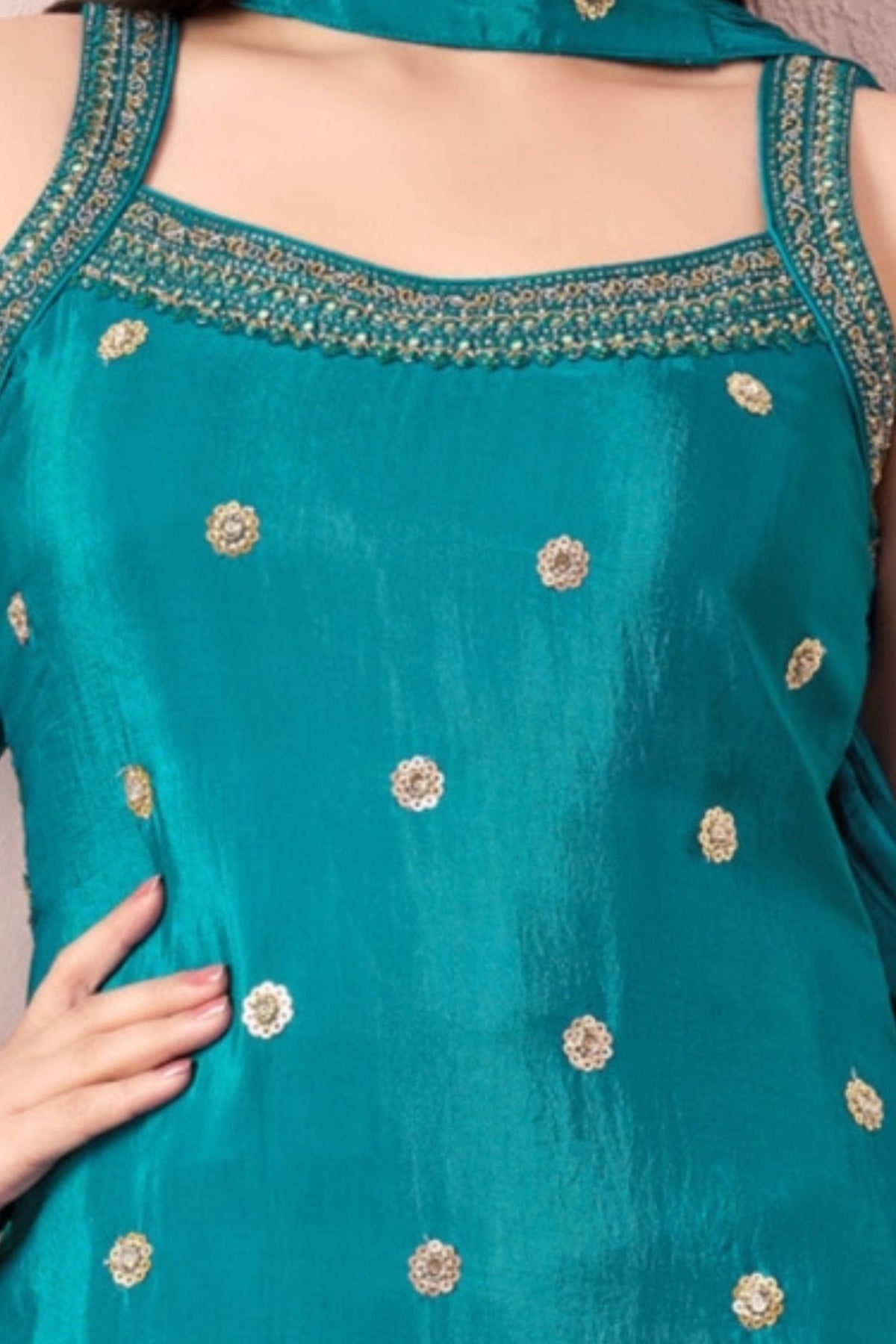 | Features | Sequins, Zari, Beads and Stone work |
