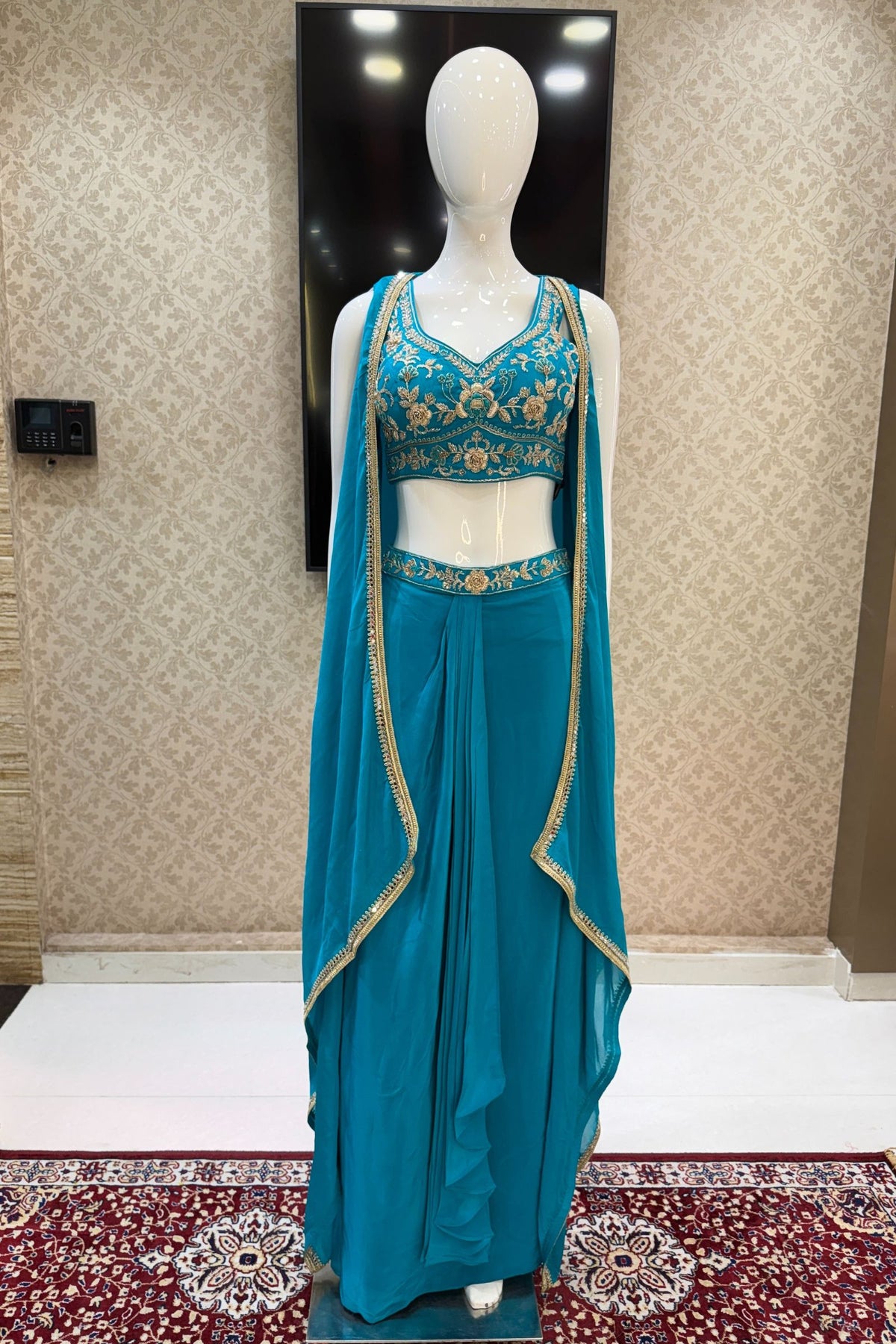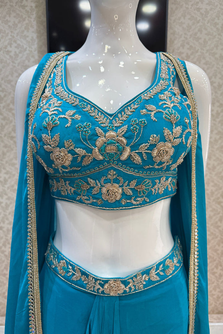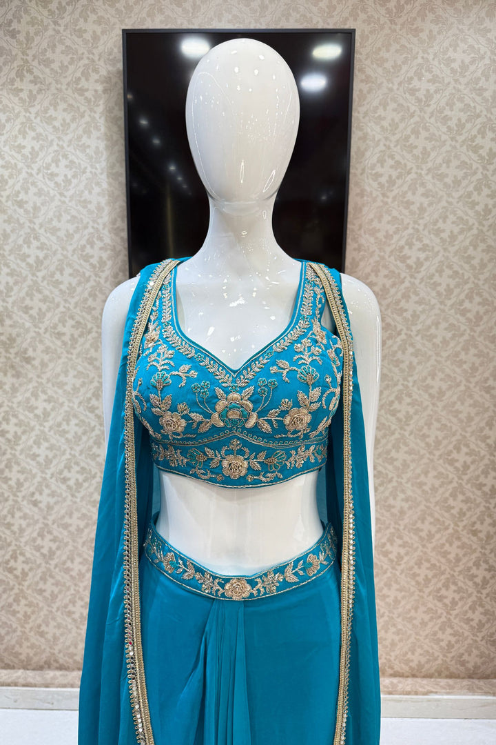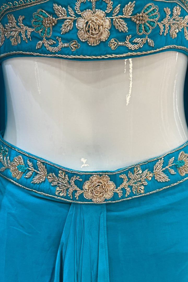 Rama Blue Zardozi, Mirror, Zari and Sequins work Shrug with Crop Top and Cowl Skirt