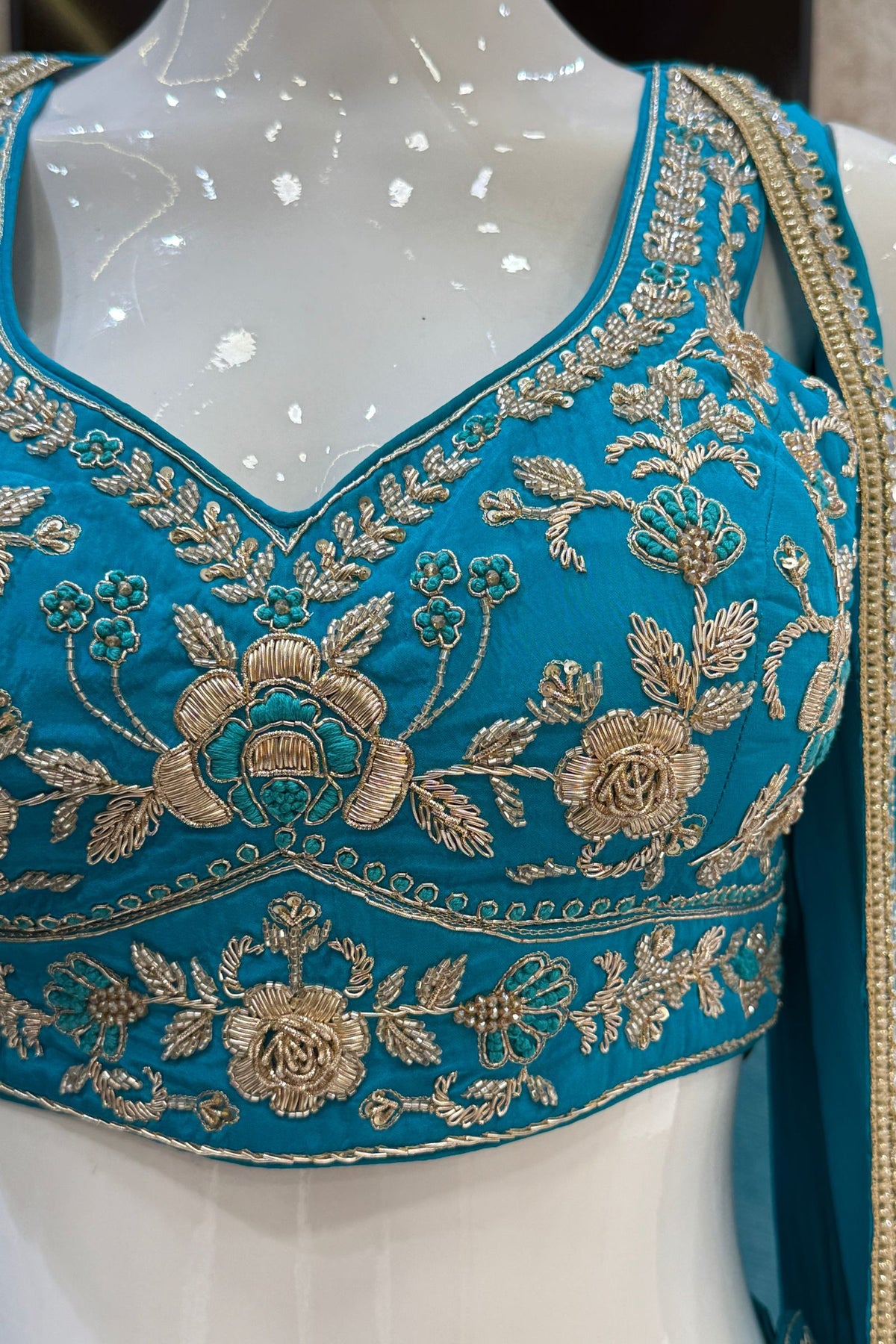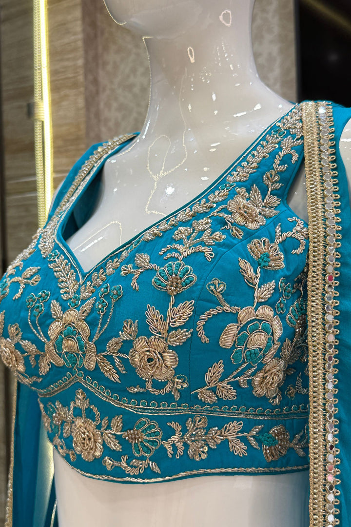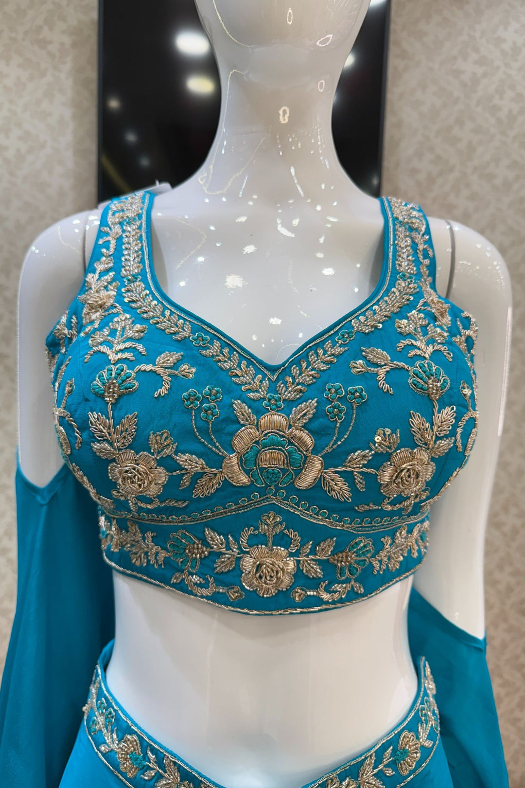 Rama Blue Zardozi, Mirror, Zari and Sequins work Shrug with Crop Top and Cowl Skirt
