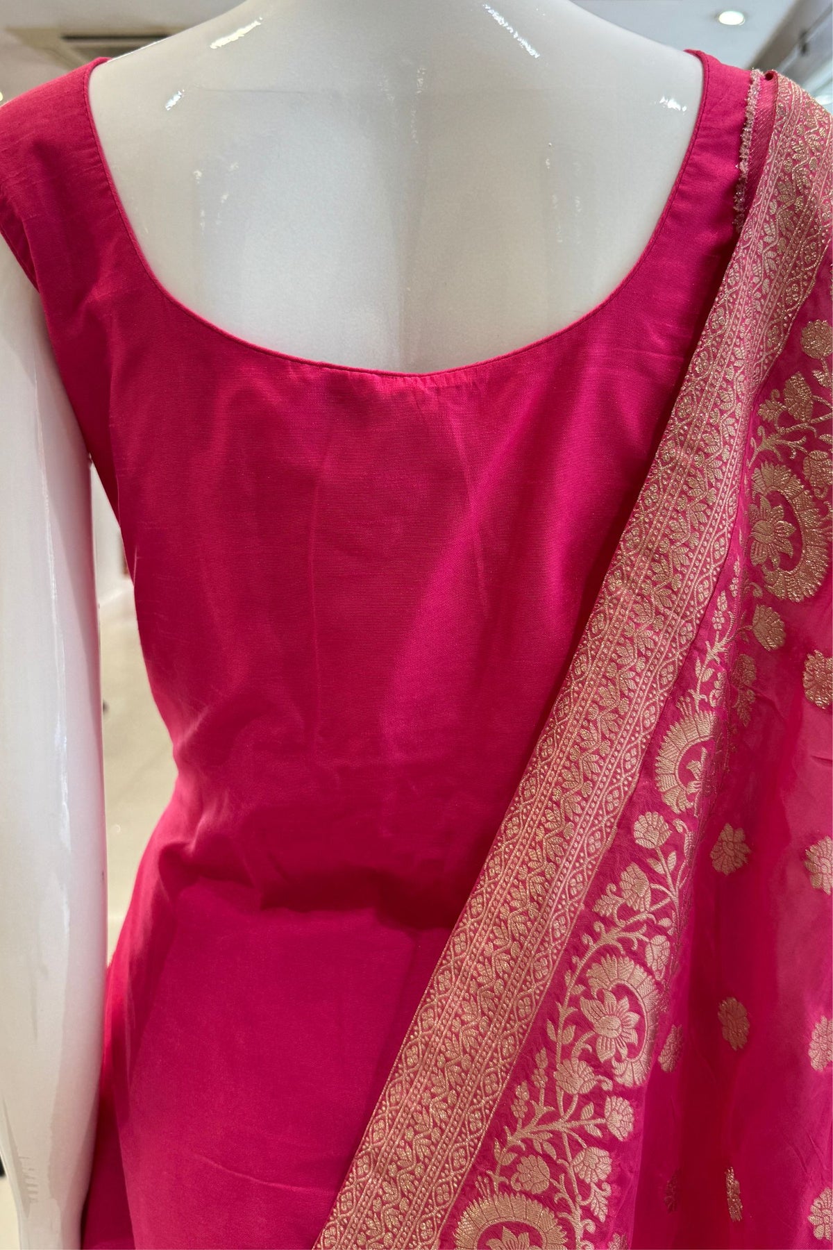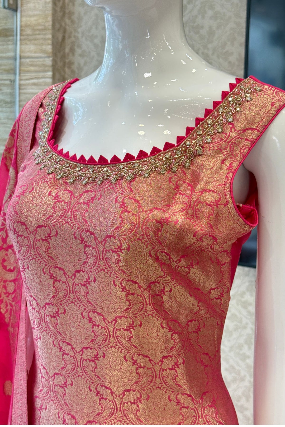 Rani Pink Beads, Mirror, Stone, Banaras and Brocade work Straight Cut Salwar Suit